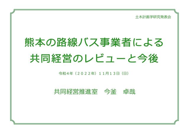 2,997 万人 2,666 万人 2,746 万人 2,705 万人 2,674 万人 2,000 2,500 3,000 3,500 4,000 平成27年度 平成28年度 平成29年度 平成30年度 令和1年度 実車走行キロ 利用者数 (万人/年、万km/年) 利用者数 走行キロ 15% 85% 黒字 赤字 資料:各社運行実績資料(各年) 資料:各社運行実績資料(R1年度) 988 932 888 899 1,029 992 959 944 850 900 950 1,000 1,050 平成27年度 平成28年度 平成29年度 平成30年度 運転士数 必要人数 (人) ▲41人 ▲60人 ▲71人 ▲45人 H30年運転士 県内の運行系統 熊本におけるバス交通のあり方 検討会において、熊本地域の“あ るべきバス路線網”や経営問題の 解消策を検討 (公共交通の課題・将来の見通し) 3~5年先のサービス提供を維持 できない可能性が危惧され、今後 の人口減少・超高齢社会を見据え た公共交通ネットワークの維持・ 拡充策が必要 資料:各社雇用・退職等実績資料(各年) (熊本地域の乗合バスを取り巻く現状)