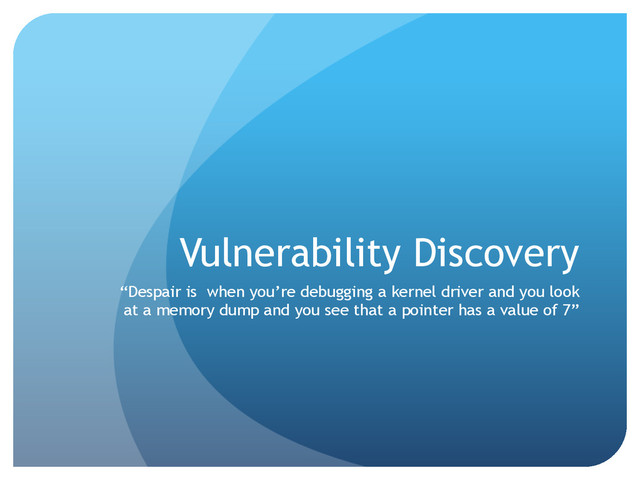 Find locations where input-controlled (or input- influenced) variable ‘x’ is used to dereference into memory Search for example where some value of ‘x’ results in an out of bounds read or write Then you have found a vulnerability