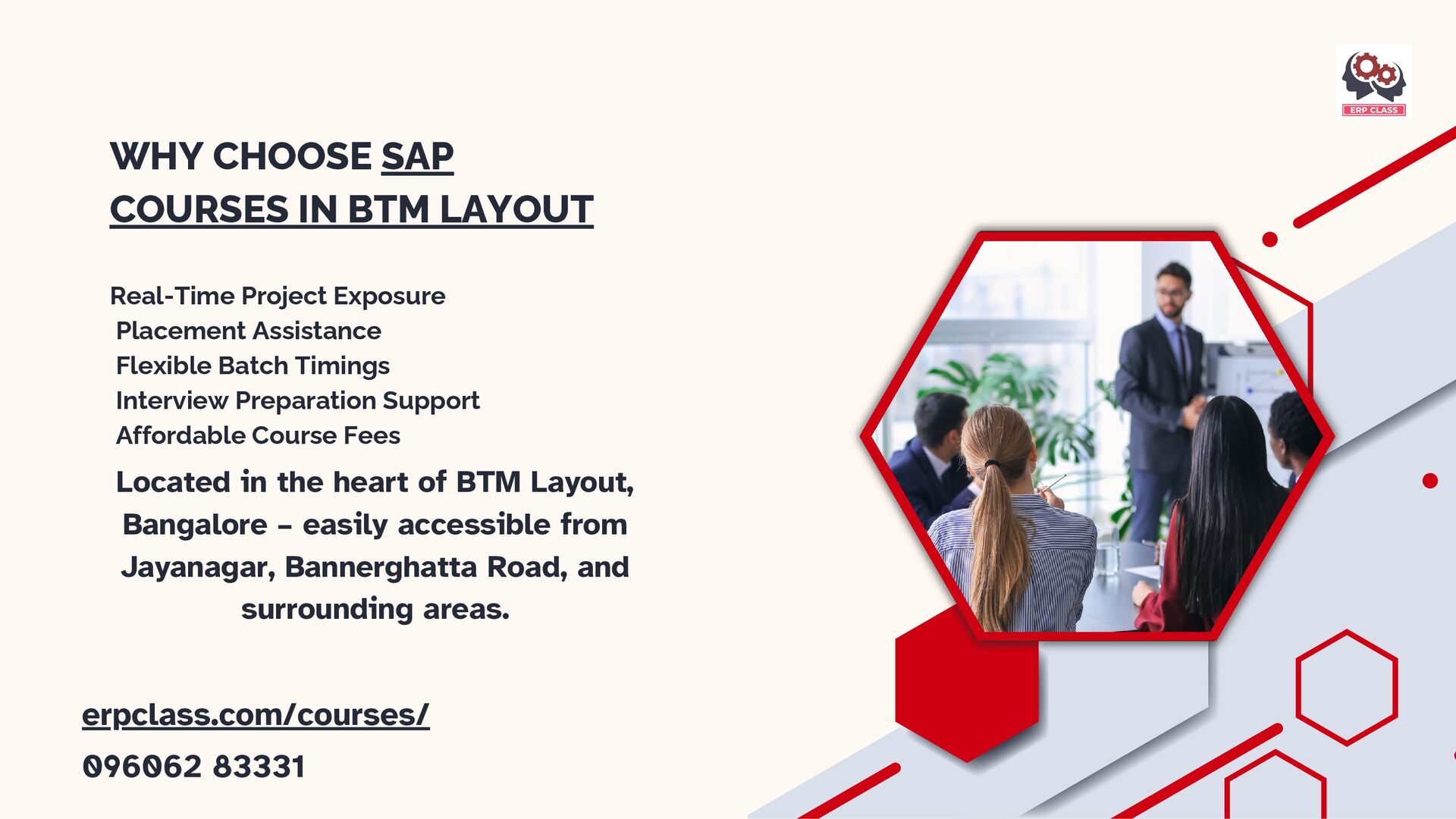 If you are searching for the best SAP Courses in BTM Layout, choosing the right training institute can make a huge difference in your career growth. BTM Layout, one of Bangalore’s prime educational hubs, is home to many professional training centers that offer industry-focused SAP programs designed to meet the demands of today’s competitive job market.