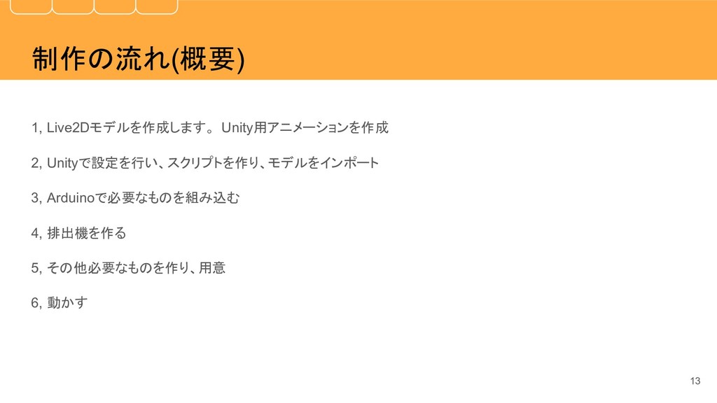 制作の流れ(概要) 1, Live2Dモデルを作成します。 Unity用アニメーションを作成 2, Unityで設定を行い、スクリプトを作り、モデルをインポート 3, Arduinoで必要なものを組み込む 4, 排出機を作る
