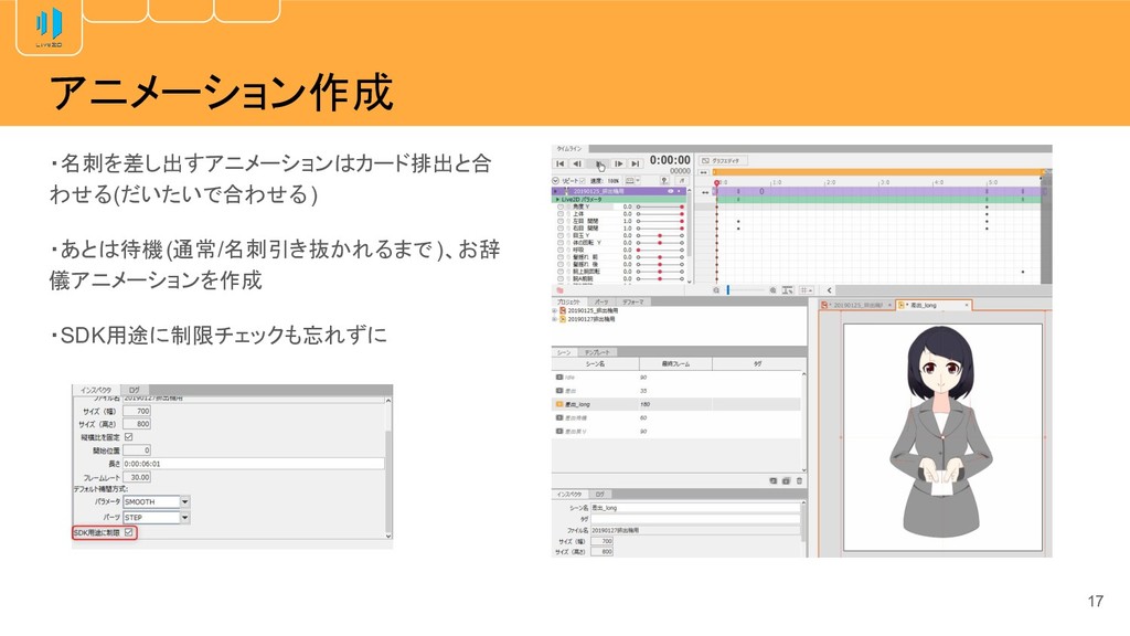 アニメーション作成 ・名刺を差し出すアニメーションはカード排出と合 わせる(だいたいで合わせる ) ・あとは待機(通常/名刺引き抜かれるまで )、お辞 儀アニメーションを作成 ・SDK用途に制限チェックも忘れずに 17