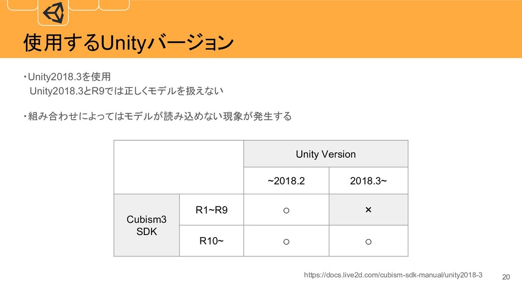 使用するUnityバージョン ・Unity2018.3を使用 Unity2018.3とR9では正しくモデルを扱えない ・組み合わせによってはモデルが読み込めない現象が発生する 20 https://docs.live2d.com/cubism-sdk-manual/unity2018-3 Unity Version ~2018.2 2018.3~