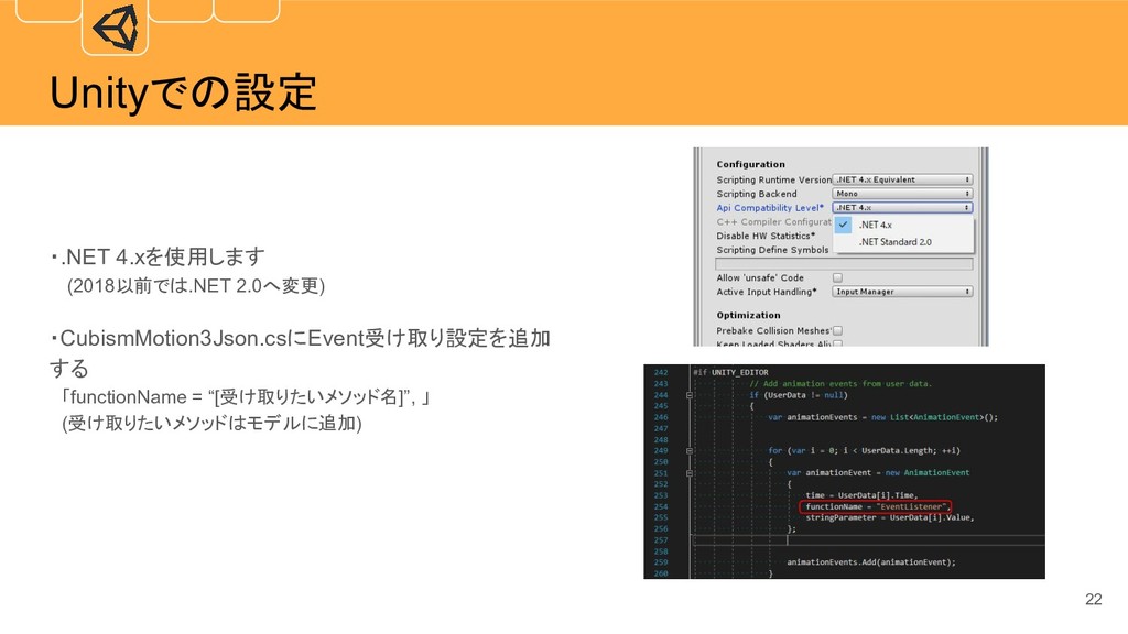 Unityでの設定 22 ・.NET 4.xを使用します (2018以前では.NET 2.0へ変更) ・CubismMotion3Json.csにEvent受け取り設定を追加 する 「functionName