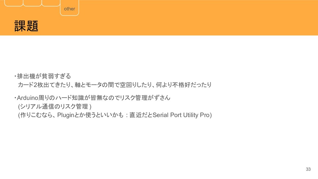 課題 ・排出機が貧弱すぎる カード2枚出てきたり、軸とモータの間で空回りしたり、何より不格好だったり ・Arduino周りのハード知識が皆無なのでリスク管理がずさん (シリアル通信のリスク管理 ) (作りこむなら、Pluginとか使うといいかも : 直近だとSerial Port