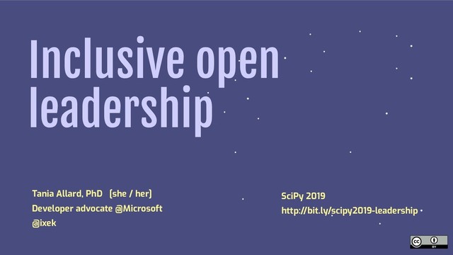 In this talk, I will draw from my experience building, and leading communities of practice and open source projects to introduce the concept of inclusive leadership and provide practical guidance on ways to engage a diverse range of contributors in the long term. I will also present techniques and resources I have used when mentored people from underrepresented backgrounds to step up into positions of leadership in the open source world.