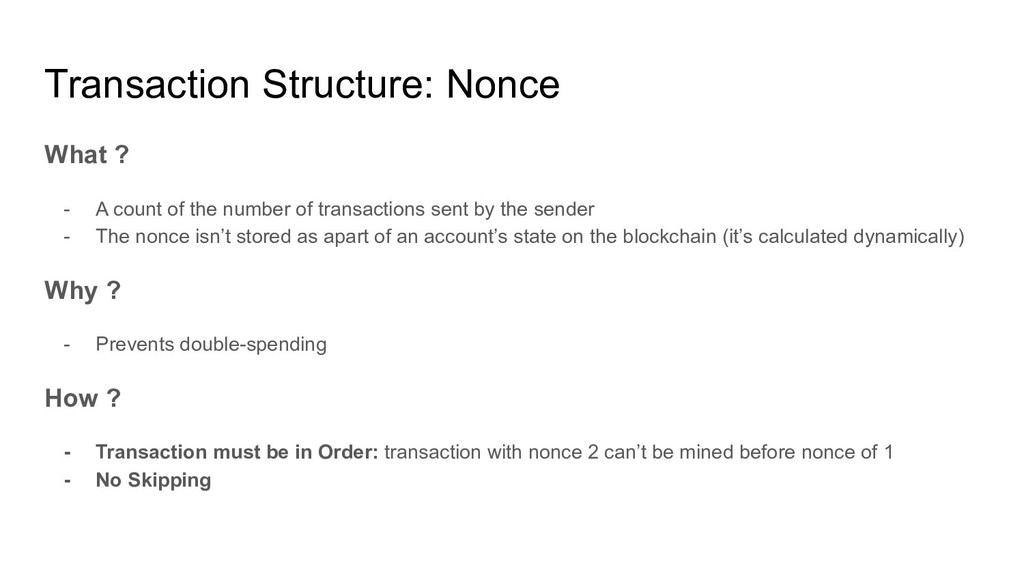 transaction structure 2. Compute the Keccak-256 hash of serialized message 3. Compute the ECDSA signature: signing the hash with EOA private key 4. Append the ECDSA signature’s computed v, r, s to the transaction Transaction (nonce, gas price, gas limit, data, value, v, r=0, s=0) Serialized message (hex string) Transaction hash Signed raw transaction (1) (2) (3, 4)