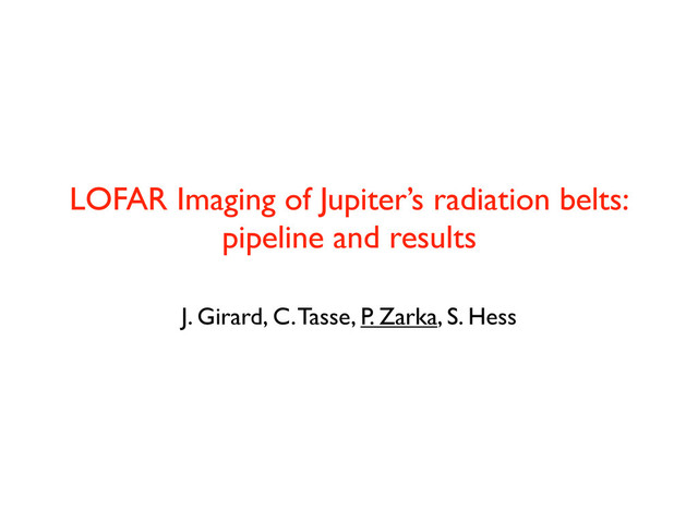 resolved images at 127-172 MHz, 20-25 mJy/beam • Girard et al. proceedings published [SF2A, 2012] ; A&A paper in preparation Summary & Perspectives • LC0_005 proposal « Saturn’s deep atmosphere » (Courtin et al.) : HBA • LC0_007 proposal «Exoplanet radio search » (Zarka et al.) : LBA • LC0_006 proposal « Jupiter's Synchrotron Radiation » (de Pater et al.) : LBA & HBA + possible joint - polarization, extent to LF ? (LBA range), spectral variations ? - 3D reconstruction of B field by tomography - topology of multipolar BJup at low latitudes close to the planet - electron acceleration & transport : pitch angle scattering, inward diffusion, effect of satellites, inter - comparison with models (Salammbô 3D) - time variability, magnetospheric dynamics [de Pater & Sault, 1998] [Connerney et al., 1993 ; Santos-Costa, 2009]