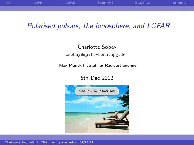 of B0823+26 II LOFAR observation in total intensity (3 hr, HBA, 48 MHz, I) Again, in one observation, switch between quiet to bright mode Interesting: previously thought ‘off’ mode actually just ‘quiet’ (emission still present) Figure: L: I(time,phase) quiet mode, M: I(time,phase) bright mode, R: Single pulse profiles (C. Sobey, J. Hessels, LOFAR PWG) Charlotte Sobey. MPIfR. TKP meeting Amsterdam. 05/12/12