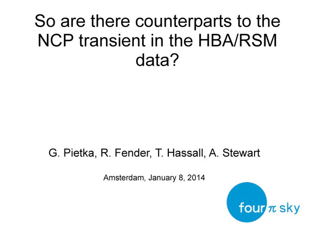 of epochs NCP =1897 FoV RSM =219deg2 Nr of epochs RSM =720 Flux limit = 4 Jy Flux limit =1Jy R RSM (1Jy) = 219deg2×720 epochs 175deg2×1897 epochs ×( 1Jy 4 Jy ) −3/2 =3.8 R∝F−3/2 α=0 First for spectral index , 25 Jy NCP source will be 25 Jy also in the RSM data. So we would expect 3.8 NCP-Like transients in 10s RSM Low DM search