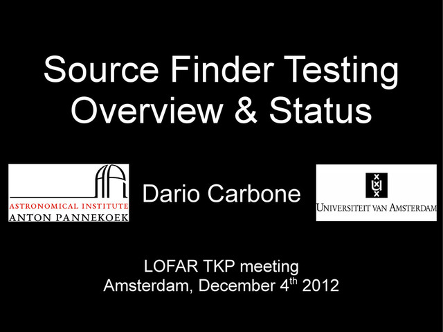 D. Carbone, P. Carroll, A. Dabbech, H. Garsden, A. van der Horst, A. Mints, R. Paladino, D. Rafferty, A. Rowlinson, A. Shulevski, J. Swinbank, S. van Velzen. http://www.lofar.org/wiki/doku.php?id=commissioning:source_finders Main aims • Identify the best settings for automatically running source finders in LOFAR/MSSS/TRAP pipelines • Report bugs and needs to developers and provide support to LOFAR users • LOFAR representative in the international radio source finding discussion