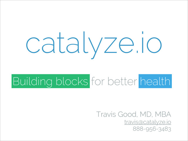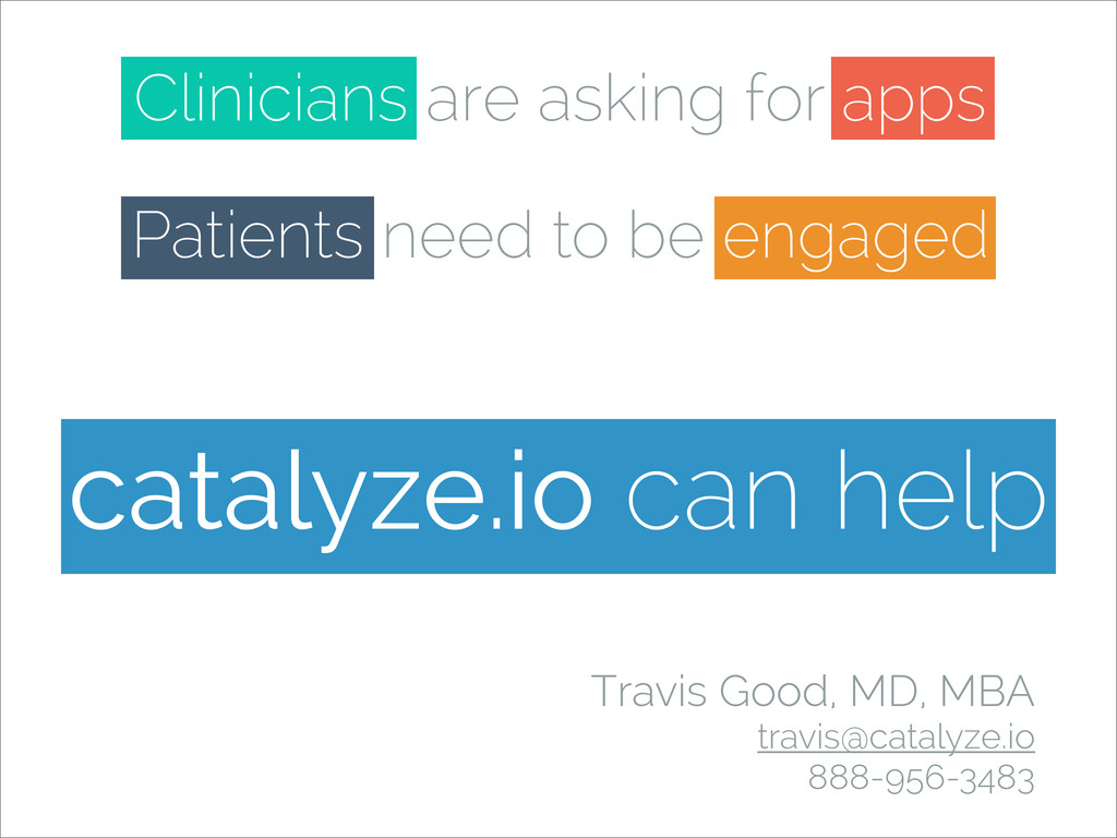 This was the first presentation we did on catalyze.io. The audience was a mix of CIOs, vendors, startups, and investors - all in healthcare. The length limited by the organizers to 3 slides = 5 minutes. We hope you enjoy it!