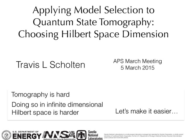 Dimension Travis L Scholten APS March Meeting 5 March 2015 Tomography is hard Sandia National Laboratories is a multi-program laboratory managed and operated by Sandia Corporation, a wholly owned subsidiary of Lockheed Martin Corporation, for the U.S. Department of Energy’s National Nuclear Security Administration under contract DE-AC04-94AL85000. Let’s make it easier… Doing so in infinite dimensional Hilbert space is harder