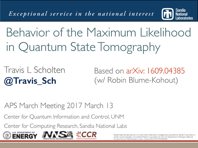 L Scholten and Robin Blume-Kohout Center for Computing Research (CCR), Sandia National Labs and University of New Mexico (Dated: September 14, 2016) Quantum state tomography on a d-dimensional system demands resources that grow rapidly with d. Model selection can be used to tailor the number of fit parameters to the data, but quantum tomography violates some common assumptions that underly canonical model selection techniques arXiv:1609.04385 h (⇢0 , Md)i ⇡ 2rd r2 + rq2 + N(N + q2) ⇡ ✓ ⇡ 2 sin 1 ✓ q 2 p N ◆◆ q(q2 + 26N) 24⇡ p 4N q2 (10) where q is given in Equation (8), N = d r, and r = Rank(⇢0 ). Equation (10) is our main result. To test its validity, we compare it to numerical simulations for d = 2, . . . , 30 and r = 1, . . . , 10, in Figure 3. The prediction of the Wilks Theorem is wildly incorrect for r ⌧ d. In contrast, Equation 10 is almost perfectly accurate when r ⌧ d, but it does begin to break down (albeit fairly gracefully) as r becomes comparable to d. We conclude that our analysis [and Equation (10)] correctly models tomography if the and H5 erodyn MLEs merical d, we a an emp pair. N = d r r = Rank(⇢0) hTr[(ˆ ⇢d ⇢0)2]i ght: The nu- of ˆ ⇢ into two s = ˆ ⇢ ⇢0 , simplify the onstraint and -dimensional mation when ement of the n the “L” do ained by the rom classical has Gaussian jk i = 1. As “L”, h i L = e the bound- Here, we turn e for finding he eigenbasis pendix I for a more detailed discussion of this series of approximations.) To proceed with truncation, we observe that the j are symmetrically distributed around = 0, so half of them are negative. Therefore, with high probabil- ity, Tr [Trunc(ˆ ⇢)] > 1, and so we will need to subtract q1l from ˆ ⇢ before truncating. The appropriate q solves Tr [Trunc(ˆ ⇢ q1l)] = 1. This equation can be solved us- ing the ansatz established so far, and some series expan- sions (see Appendix I) yield the solution: q ⇡ 2 p N (240r⇡)2/5 4 N1/10 + (240r⇡)4/5 80 N 3/10. (8) Now that we know how much to subtract o↵ in the truncation process, we can compute h i kite . Defining (x)+ = max(x, 0): h i kite = * r X j=1 [⇢jj (pj q)]2 + N X j=1 ⇥ (j q)+ ⇤2 + Z p Not the same as Wilks Theorem! …by approximating the expected mean-squared error. Depends on true state! (See paper for techniques used.)