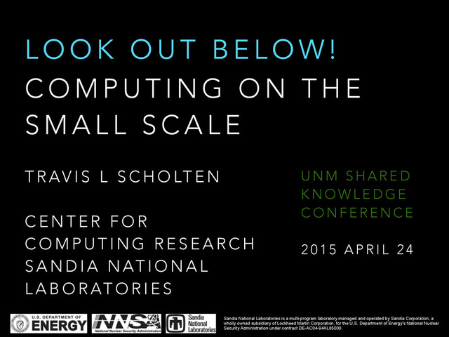 N T H E S M A L L S C A L E L O O K O U T B E L O W ! T R AV I S L S C H O LT E N ! C E N T E R F O R C O M P U T I N G R E S E A R C H S A N D I A N AT I O N A L L A B O R AT O R I E S U N M S H A R E D K N O W L E D G E C O N F E R E N C E ! 2 0 1 5 A P R I L 2 4 Sandia National Laboratories is a multi-program laboratory managed and operated by Sandia Corporation, a wholly owned subsidiary of Lockheed Martin Corporation, for the U.S. Department of Energy’s National Nuclear Security Administration under contract DE-AC04-94AL85000.