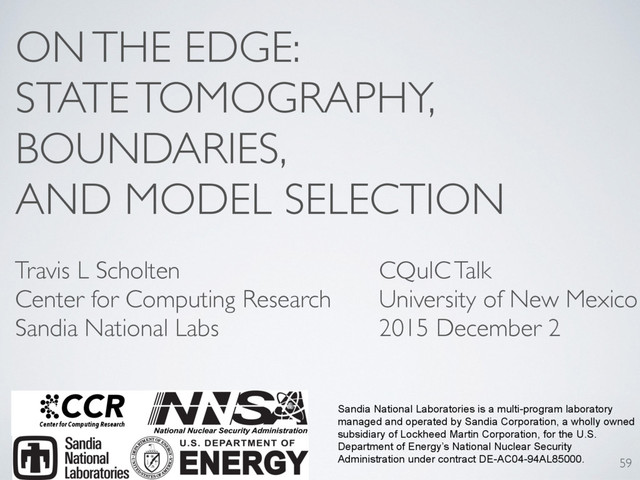 L Scholten Center for Computing Research Sandia National Labs CQuIC Talk University of New Mexico 2015 December 2 Sandia National Laboratories is a multi-program laboratory managed and operated by Sandia Corporation, a wholly owned subsidiary of Lockheed Martin Corporation, for the U.S. Department of Energy’s National Nuclear Security Administration under contract DE-AC04-94AL85000. CCR Center for Computing Research 59