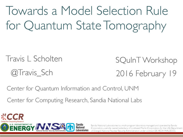 L Scholten @Travis_Sch Center for Quantum Information and Control, UNM Center for Computing Research, Sandia National Labs SQuInT Workshop 2016 February 19 Sandia National Laboratories is a multi-program laboratory managed and operated by Sandia Corporation, a wholly owned subsidiary of Lockheed Martin Corporation, for the U.S. Department of Energy’s National Nuclear Security Administration under contract DE-AC04-94AL85000. CCR Center for Computing Research