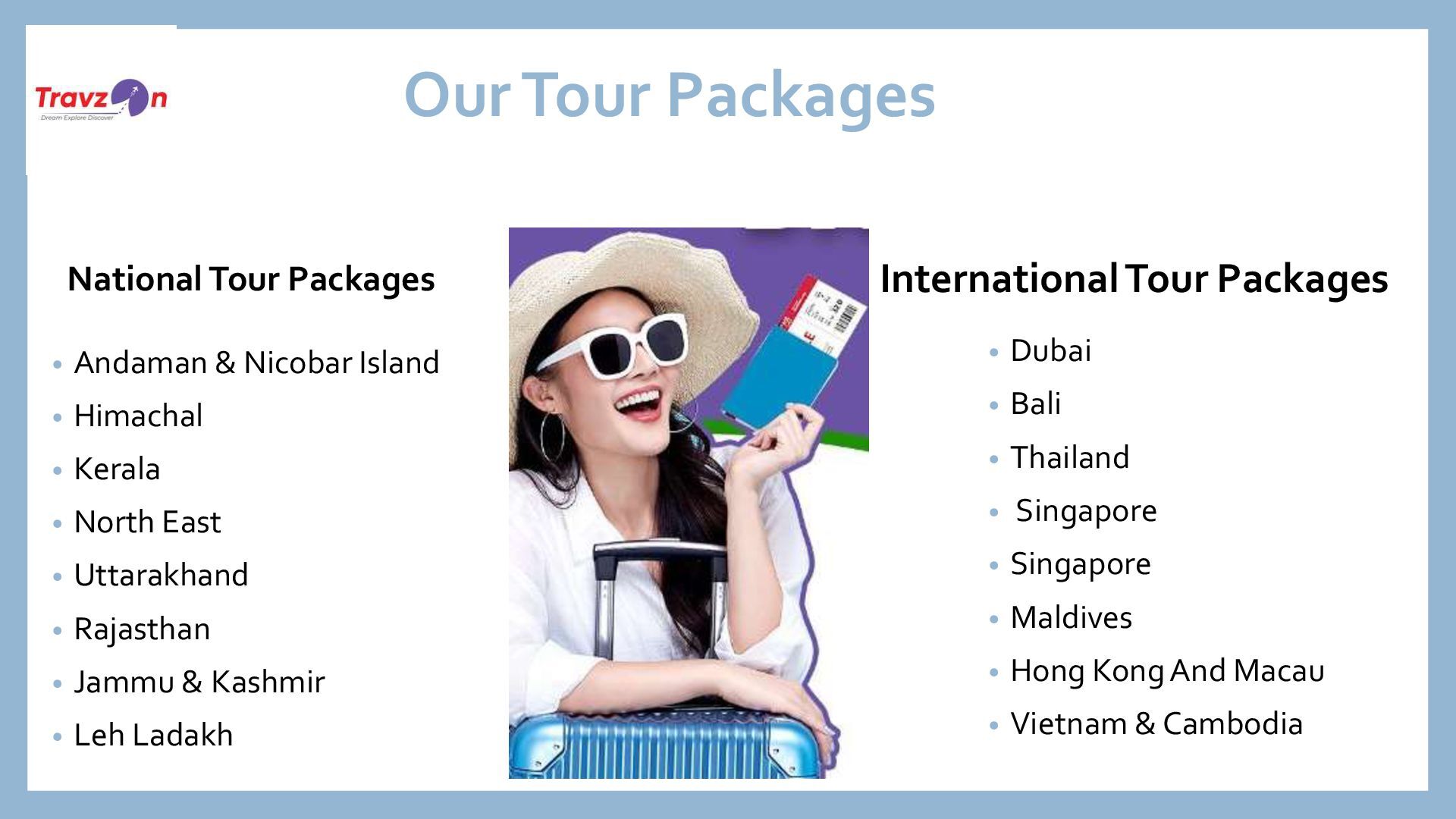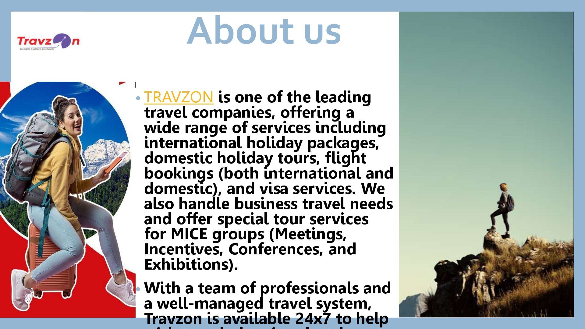 companies, offering a wide range of services including international holiday packages, domestic holiday tours, flight bookings (both international and domestic), and visa services. We also handle business travel needs and offer special tour services for MICE groups (Meetings, Incentives, Conferences, and Exhibitions). • With a team of professionals and a well-managed travel system, Travzon is available 24x7 to help