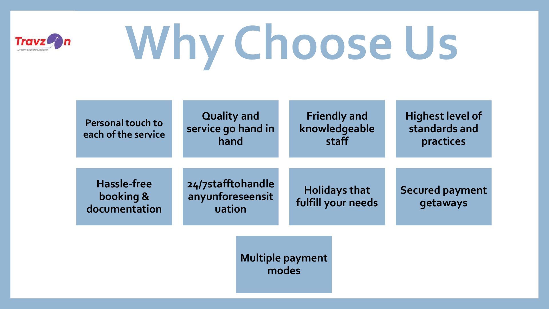 Quality and service go hand in hand Friendly and knowledgeable staff Highest level of standards and practices Hassle-free booking & documentation 24/7stafftohandle anyunforeseensit uation Holidays that fulfill your needs Secured payment getaways Multiple payment modes