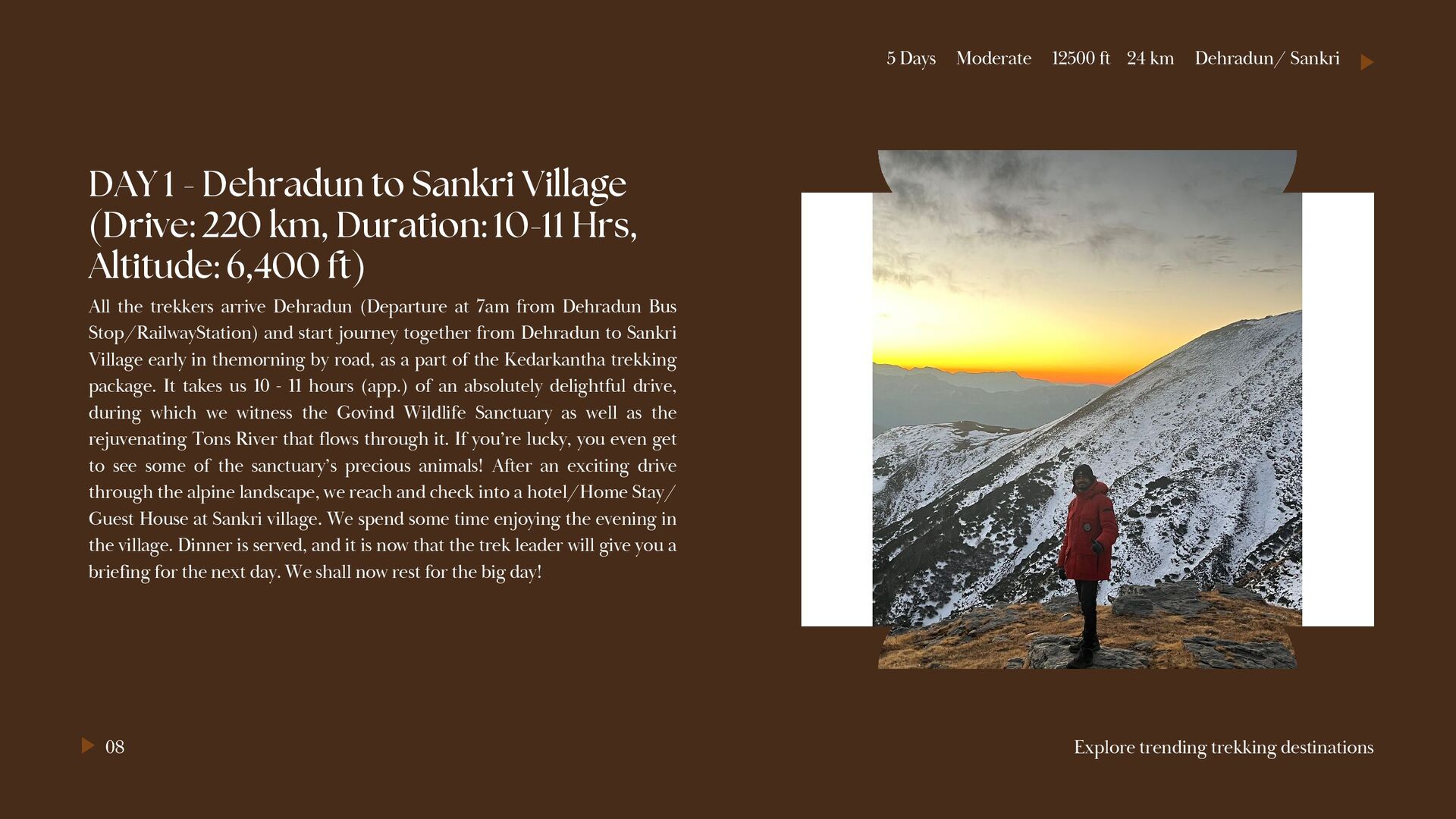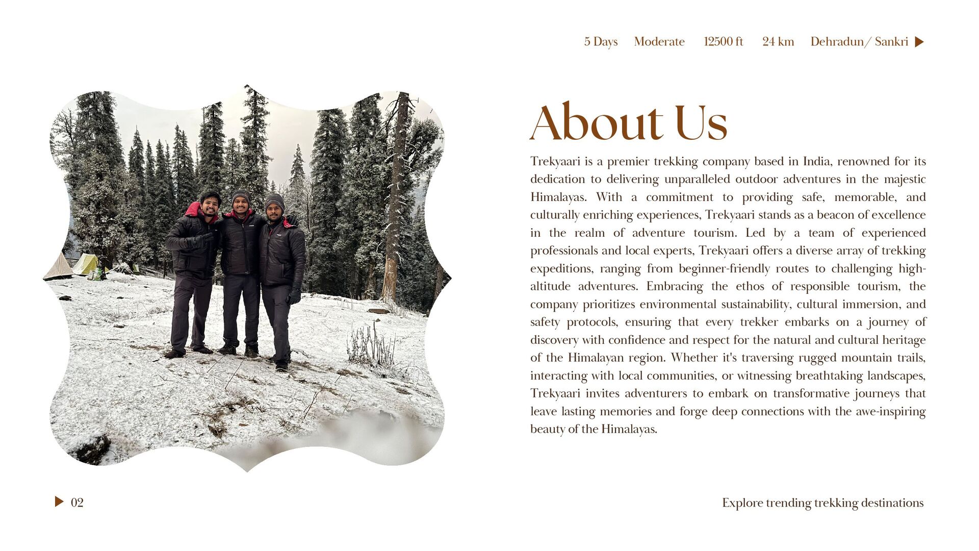 ft 24 km Dehradun/ Sankri Trekyaari is a premier trekking company based in India, renowned for its dedication to delivering unparalleled outdoor adventures in the majestic Himalayas. With a commitment to providing safe, memorable, and culturally enriching experiences, Trekyaari stands as a beacon of excellence in the realm of adventure tourism. Led by a team of experienced professionals and local experts, Trekyaari offers a diverse array of trekking expeditions, ranging from beginner-friendly routes to challenging high- altitude adventures. Embracing the ethos of responsible tourism, the company prioritizes environmental sustainability, cultural immersion, and safety protocols, ensuring that every trekker embarks on a journey of discovery with confidence and respect for the natural and cultural heritage of the Himalayan region. Whether it's traversing rugged mountain trails, interacting with local communities, or witnessing breathtaking landscapes, Trekyaari invites adventurers to embark on transformative journeys that leave lasting memories and forge deep connections with the awe-inspiring beauty of the Himalayas. 02