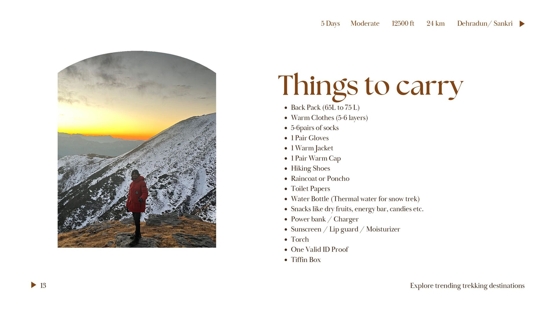 km Dehradun/ Sankri 13 Things to carry Back Pack (65L to 75 L) Warm Clothes (5-6 layers) 5-6pairs of socks 1 Pair Gloves 1 Warm Jacket 1 Pair Warm Cap Hiking Shoes Raincoat or Poncho Toilet Papers Water Bottle (Thermal water for snow trek) Snacks like dry fruits, energy bar, candies etc. Power bank / Charger Sunscreen / Lip guard / Moisturizer Torch One Valid ID Proof Tiffin Box
