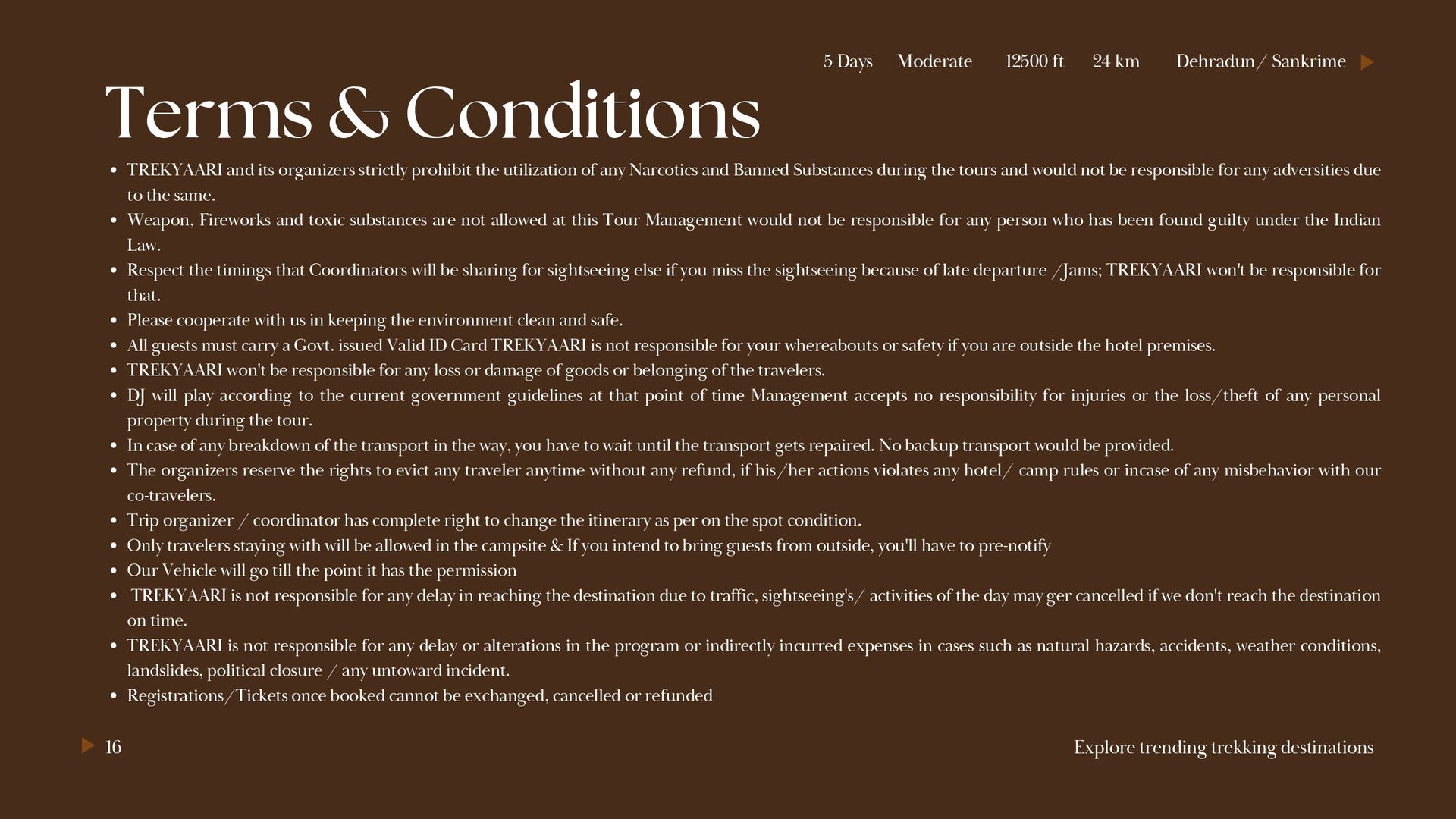 km Dehradun/ Sankrime 16 Terms & Conditions TREKYAARI and its organizers strictly prohibit the utilization of any Narcotics and Banned Substances during the tours and would not be responsible for any adversities due to the same. Weapon, Fireworks and toxic substances are not allowed at this Tour Management would not be responsible for any person who has been found guilty under the Indian Law. Respect the timings that Coordinators will be sharing for sightseeing else if you miss the sightseeing because of late departure /Jams; TREKYAARI won't be responsible for that. Please cooperate with us in keeping the environment clean and safe. All guests must carry a Govt. issued Valid ID Card TREKYAARI is not responsible for your whereabouts or safety if you are outside the hotel premises. TREKYAARI won't be responsible for any loss or damage of goods or belonging of the travelers. DJ will play according to the current government guidelines at that point of time Management accepts no responsibility for injuries or the loss/theft of any personal property during the tour. In case of any breakdown of the transport in the way, you have to wait until the transport gets repaired. No backup transport would be provided. The organizers reserve the rights to evict any traveler anytime without any refund, if his/her actions violates any hotel/ camp rules or incase of any misbehavior with our co-travelers. Trip organizer / coordinator has complete right to change the itinerary as per on the spot condition. Only travelers staying with will be allowed in the campsite & If you intend to bring guests from outside, you'll have to pre-notify Our Vehicle will go till the point it has the permission TREKYAARI is not responsible for any delay in reaching the destination due to traffic, sightseeing's/ activities of the day may ger cancelled if we don't reach the destination on time. TREKYAARI is not responsible for any delay or alterations in the program or indirectly incurred expenses in cases such as natural hazards, accidents, weather conditions, landslides, political closure / any untoward incident. Registrations/Tickets once booked cannot be exchanged, cancelled or refunded