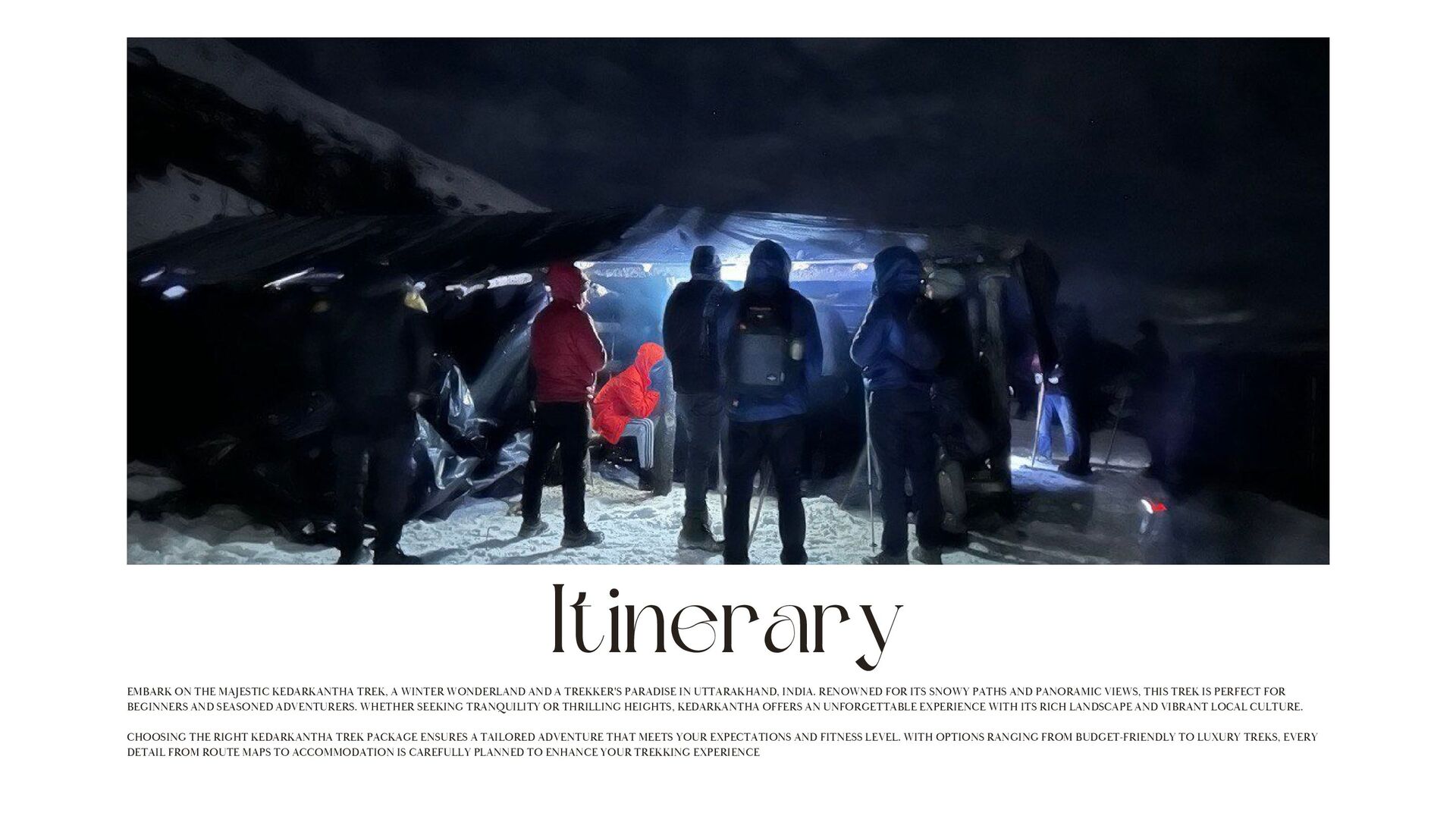 AND A TREKKER'S PARADISE IN UTTARAKHAND, INDIA. RENOWNED FOR ITS SNOWY PATHS AND PANORAMIC VIEWS, THIS TREK IS PERFECT FOR BEGINNERS AND SEASONED ADVENTURERS. WHETHER SEEKING TRANQUILITY OR THRILLING HEIGHTS, KEDARKANTHA OFFERS AN UNFORGETTABLE EXPERIENCE WITH ITS RICH LANDSCAPE AND VIBRANT LOCAL CULTURE. CHOOSING THE RIGHT KEDARKANTHA TREK PACKAGE ENSURES A TAILORED ADVENTURE THAT MEETS YOUR EXPECTATIONS AND FITNESS LEVEL. WITH OPTIONS RANGING FROM BUDGET-FRIENDLY TO LUXURY TREKS, EVERY DETAIL FROM ROUTE MAPS TO ACCOMMODATION IS CAREFULLY PLANNED TO ENHANCE YOUR TREKKING EXPERIENCE