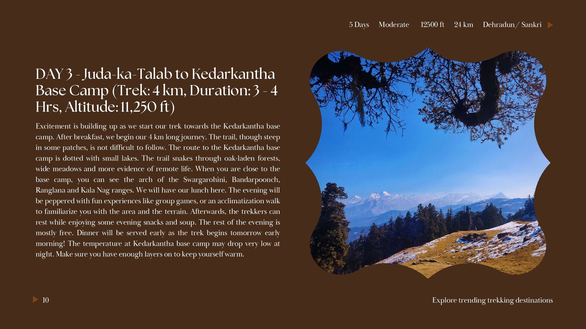 km Dehradun/ Sankri 11 DAY 4 - Kedarkantha Base Camp to Kedarkantha Peak (Altitude: 12,500 ft); Descent to Juda Ka Talab (Trek: 12 km, Duration: 7-8 Hrs, Altitude: 9,100 ft) Today, we shall cover the Kedarkantha peak. Afterwards, we shall descend from the peak to Juda ka Talab campsite, once again. The trek ahead is moderately difficult, but with a little bit of determination. Today, we commence at the early hours of 2 or 3 am, so that we can witness the glorious sunrise at the Kedarkantha peak. After breakfast, we first make our way through a few more thick patches of oak trees. The trail is mostly simple and facilitates enjoying the route uphill. It only gets slightly difficult as we get closer to the peak. As we reach the Kedarkantha peak, along with the grand view, we are greeted with a small shrine of rocks, which is considered to be holy by the locals. The energy radiating from this religious space is something that entrances one and all. The view from the top, however, is what captivates you the most. Thirteen peaks of the Himalayas, all bask together in the glory of the sun. We make a brief stop here. All this beauty deserves some admiration. Our descent is a beautiful route crossing many frozen streams and more wildlife and flora. We stop for lunch at the Kedarkantha base camp and quality conversation about the wonderful views we have been blessed with. Afterwards, we make our way downhill steadily to the Juda ka Talab campsite. Here, we set up tents for the night, light up some campfires and spends some quality time having dinner with our fellow trekkers and stay overnight here.