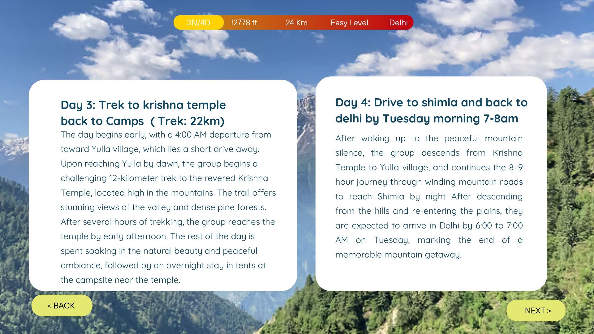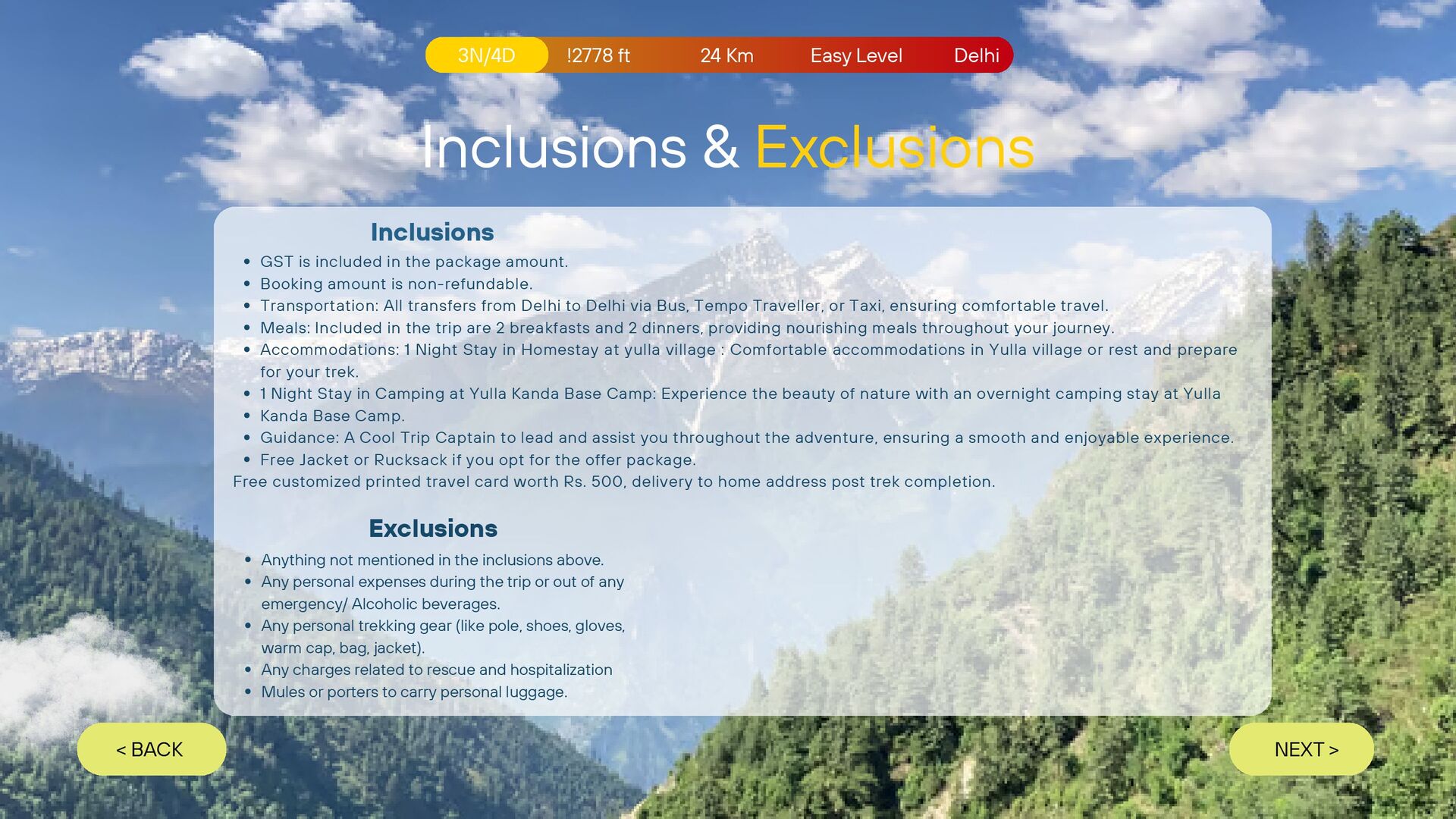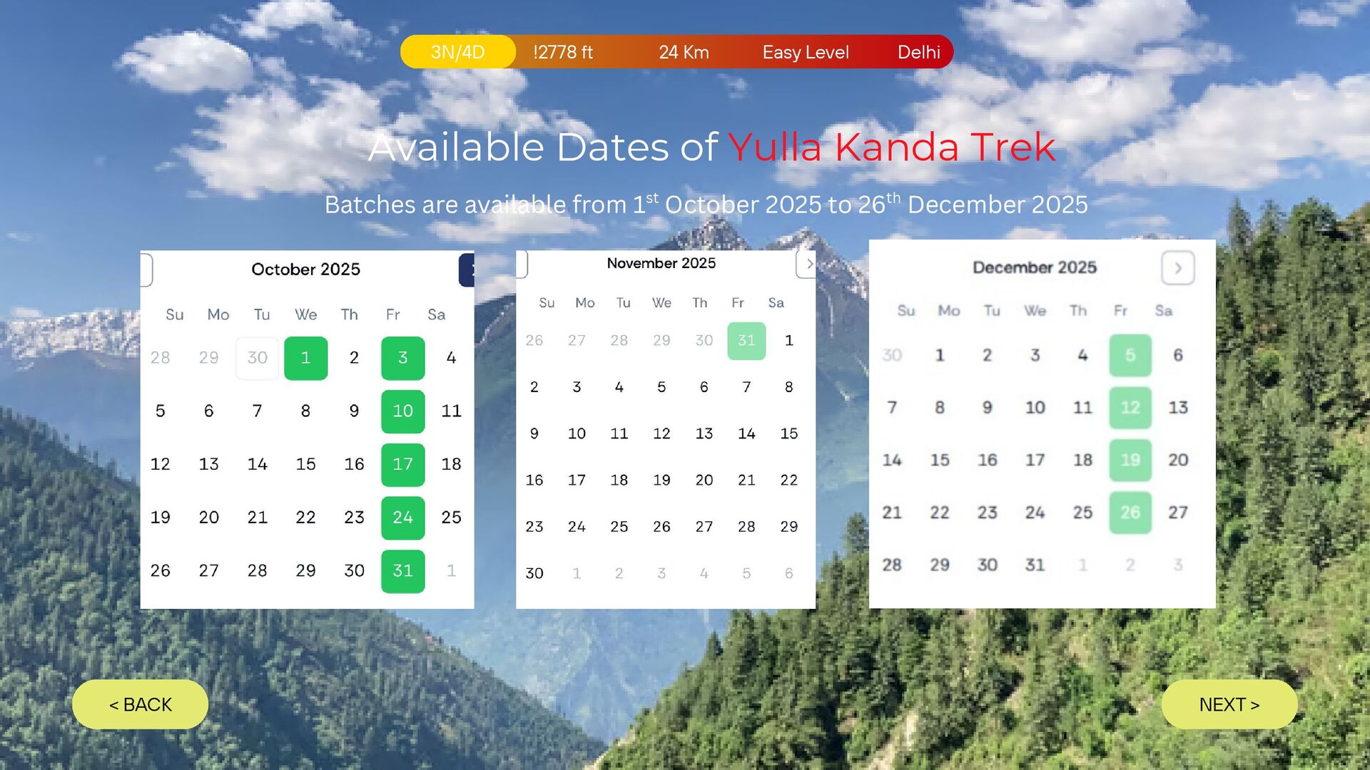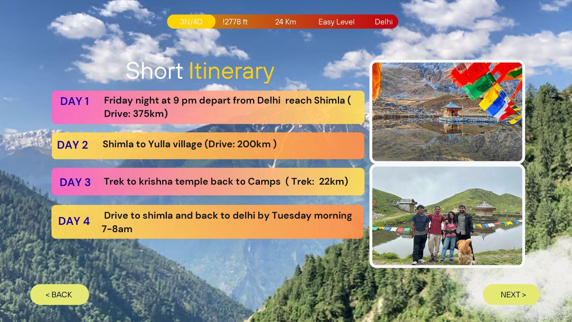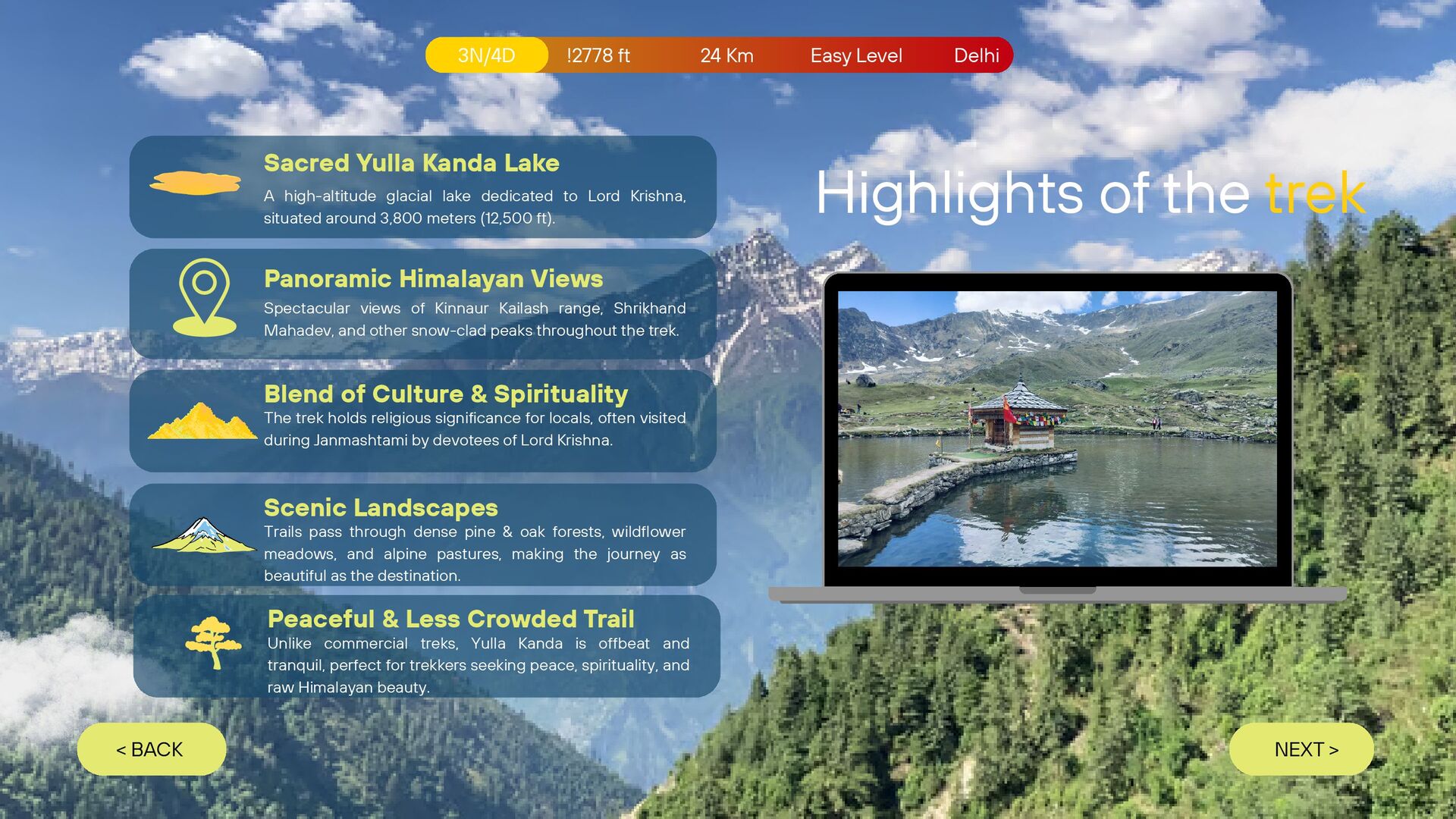 views of Kinnaur Kailash range, Shrikhand Mahadev, and other snow-clad peaks throughout the trek. Panoramic Himalayan Views Highlights of the trek The trek holds religious significance for locals, often visited during Janmashtami by devotees of Lord Krishna. Blend of Culture & Spirituality NEXT > < BACK Trails pass through dense pine & oak forests, wildflower meadows, and alpine pastures, making the journey as beautiful as the destination. Scenic Landscapes Unlike commercial treks, Yulla Kanda is offbeat and tranquil, perfect for trekkers seeking peace, spirituality, and raw Himalayan beauty. Peaceful & Less Crowded Trail A high-altitude glacial lake dedicated to Lord Krishna, situated around 3,800 meters (12,500 ft). Sacred Yulla Kanda Lake