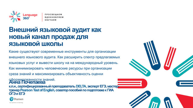 "Предоставление профессиональной высококачественной образовательной услуги в сфере обучения английскому языку в условиях жёсткой конкуренции – задача не из легких. Мы расскажем, какие существуют современные доступные инструменты для организации внешнего языкового аудита как для уже обучающихся в Вашей языковой школе студентов, так и для новых клиентов, стоящих перед выбором языкового провайдера.