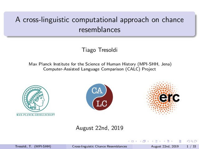 Chance resemblances can be an anathema in linguistics, given the difficulties in identifying them, and, occasionally, their usage as evidence against the comparative method. Conversely, they also tend to be among the objections towards computational approaches, as only expert knowledge and supplementary evidences would be able to confidently distinguish among vertical transmission, horizontal transmission, and chance resemblance. Limitations of this kind have been advanced since the beginnings of the comparative method, such in the frequently cited false correspondence between Latin *deus* and Ancient Greek *θεός* (both meaning “god”). The reduction, or rather expansion, *ad absurdum* of such difficulty is demonstrated both by the long tradition of folk etymologies, motivated by the assumption that surface similarities are too strong to be due to chance, and by the recurrent claims of amateur linguists on impossible relationships such as, for example, between Ainu and Etruscan.Among the sources for such difficulties is the fact that we have no clear definition on chance similarity, in general loosely defined as “words that sound similar”, particularly when there is a limited semantic leeway and preferably when judged as such with the support of the phonotactics of the languages involved. The uncertainties in terms of definition translate into limited sets of concrete examples, leading to the absence of baselines.In this talk, we investigate the question of how to create a baseline for expected probability of chance resemblance according to different typological parameters. As such, we will present the results of a cross-linguistic and computational inquiry on chance resemblances, following three different experiments. In the first, developing on Rosenfelder (2002), is a purely mathematical modeling that calculates the probability of random correspondences on a set of linguistic models of very simplified phonological and semantic assumptions. The second applies state-of-the-art algorithms for automatic cognate detection (List et al., 2018b) on languages randomly generated from phonological and semantic parameters collected from real languages of different typologies, in a massive comparison that allows to highlight which factors contribute the more to the perception of similarity; in fact, we will also explore the possibility of later re-using the dataset to collect resemblance judgements according to experts. The third and most important experiment uses actual linguistic data from a cross-linguistic database, Lexibank (forthcoming), by applying the same methods to languages pairs of varying phylogenetic relationships (Hammarström et al., 2018), which, combined with semantic information linked to Concepticon (List et al., 2018a) and CLICS (List et al., 2018c). Our results support the hypothesis that chance resemblances, even across unrelated languages, are common and indeed expected even with minor leeway, and that chance resemblances need to judged on a per-language pair and not per-potential cognate pair basis. This should allow to orient future experiment setup, besides offering a preliminary baseline on the expectancy of chance resemblance according to given sets of parameters, including language proximity in terms of lineage, possibly being incorporated into future work on automatic borrowing detection.