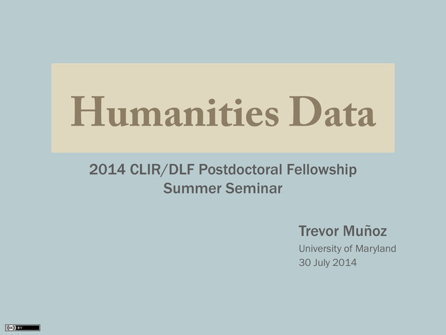 An introduction to humanities data and data curation presented at the 2014 CLIR/DLF Postdoctoral Fellowship Summer Seminar, Bryn Mawr, PA, July 30, 2014.
