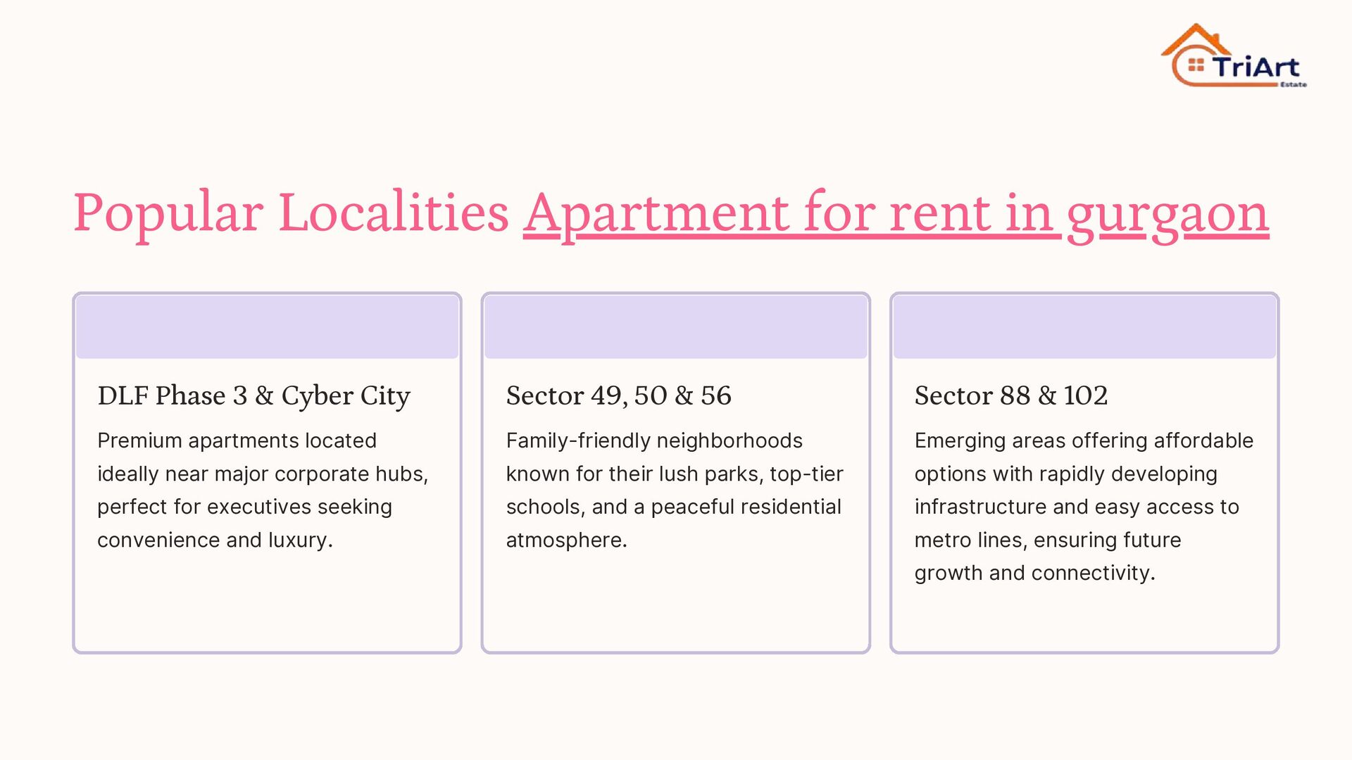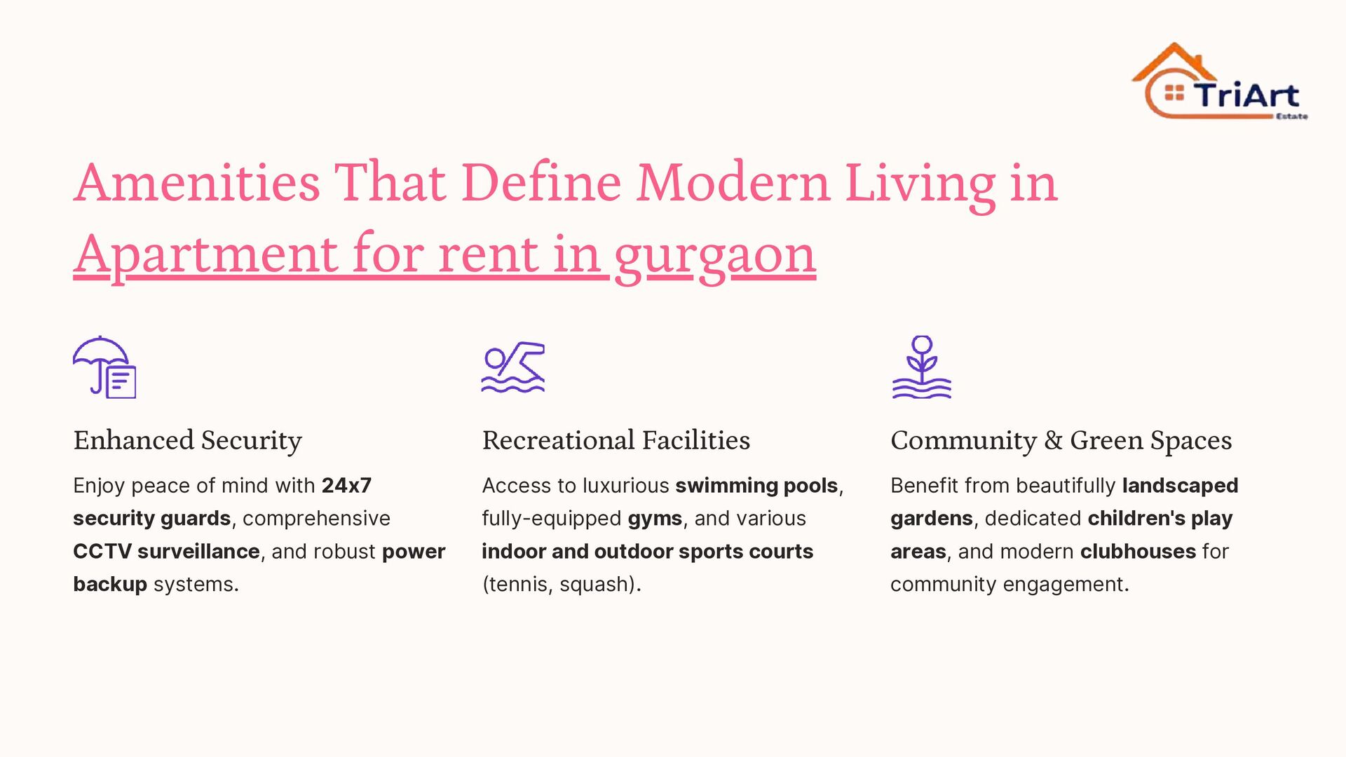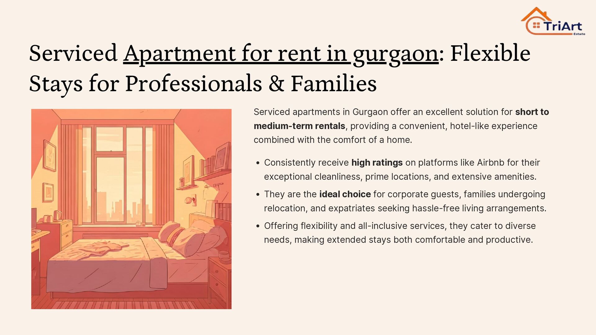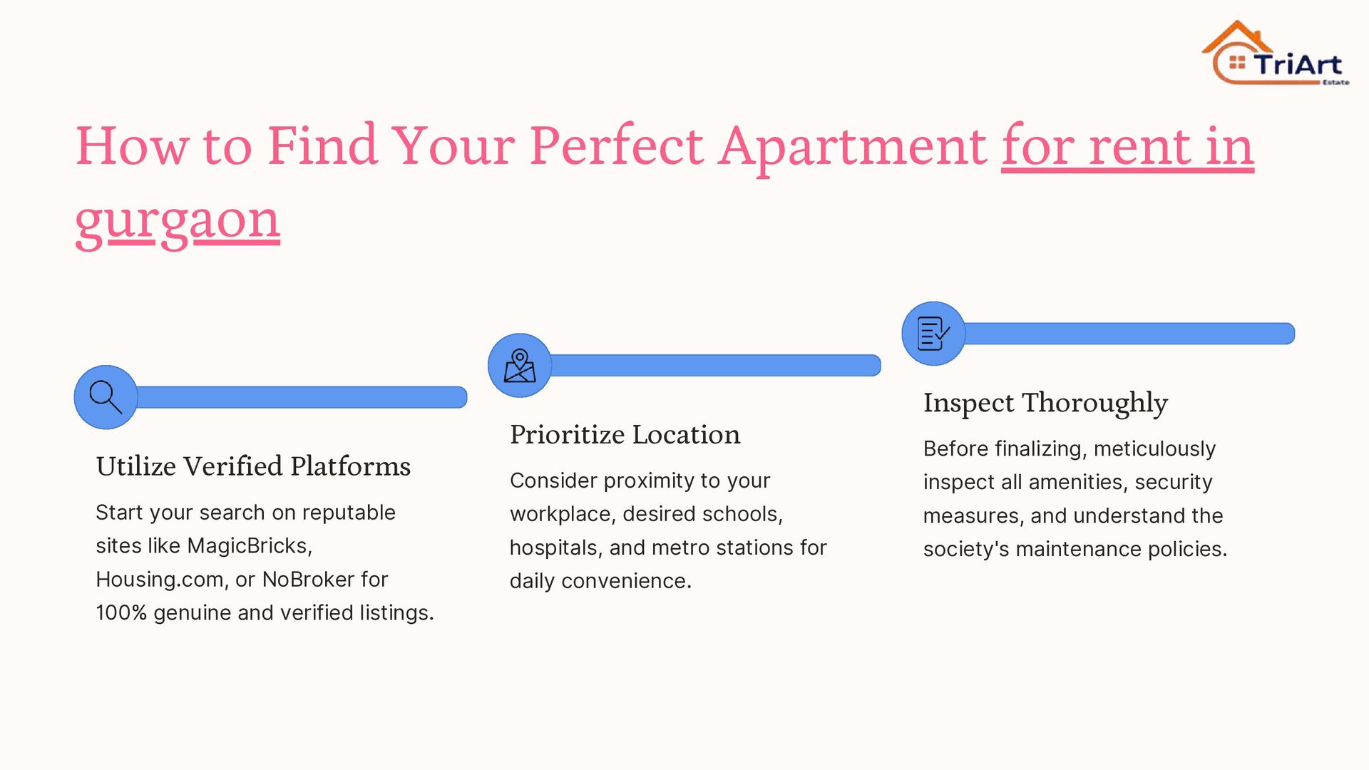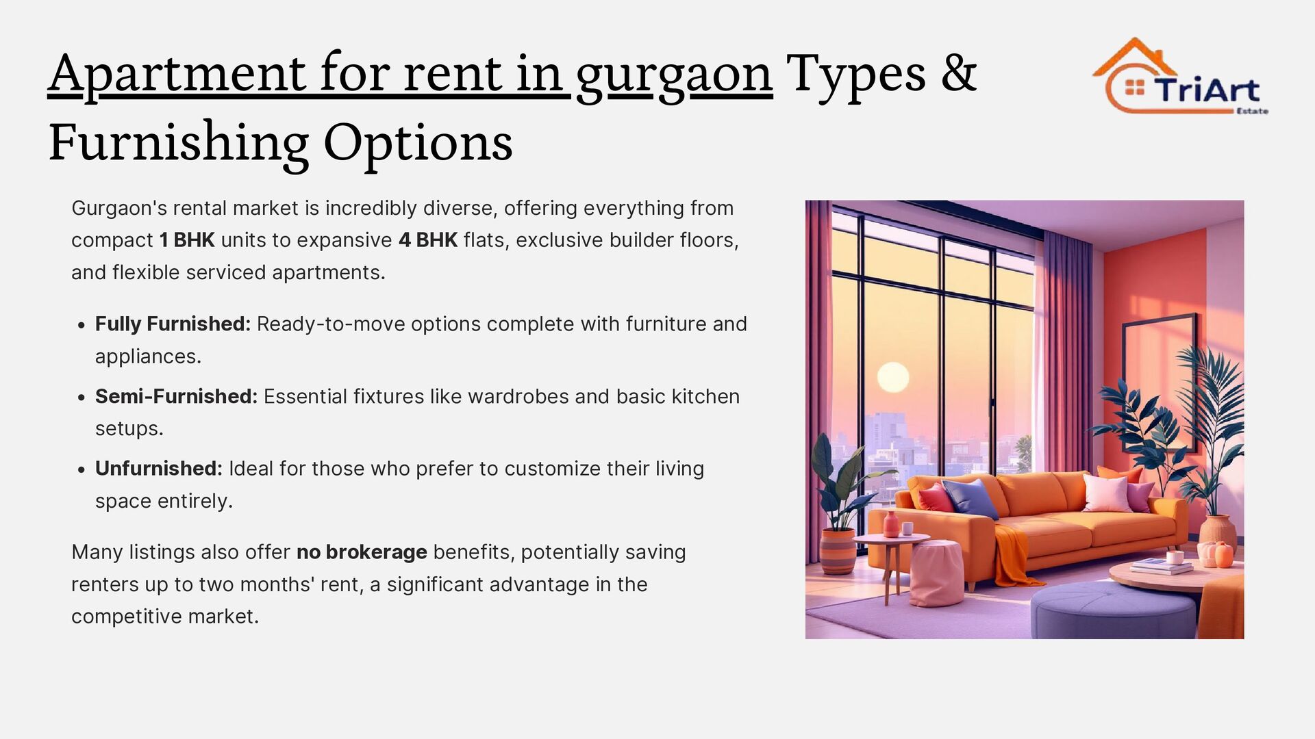 Find the best apartment for rent in Gurgaon with TriArt Estate. Explore fully furnished, semi-furnished & budget-friendly flats in prime locations with modern amenities. Get hassle-free rental assistance with verified property listings.