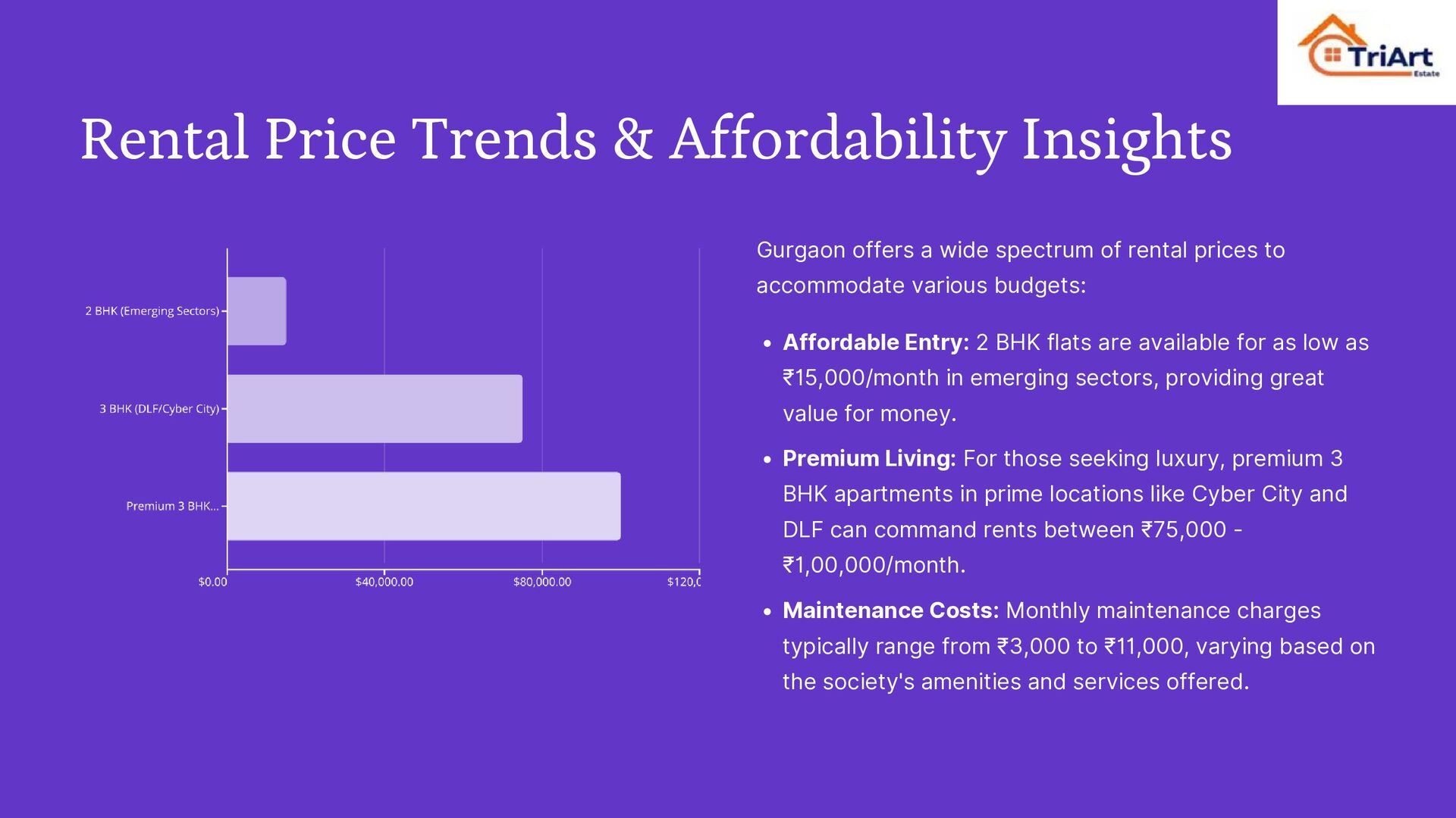 spectrum of rental prices to accommodate various budgets: Affordable Entry: 2 BHK flats are available for as low as ₹15,000/month in emerging sectors, providing great value for money. Premium Living: For those seeking luxury, premium 3 BHK apartments in prime locations like Cyber City and DLF can command rents between ₹75,000 - ₹1,00,000/month. Maintenance Costs: Monthly maintenance charges typically range from ₹3,000 to ₹11,000, varying based on the society's amenities and services offered.