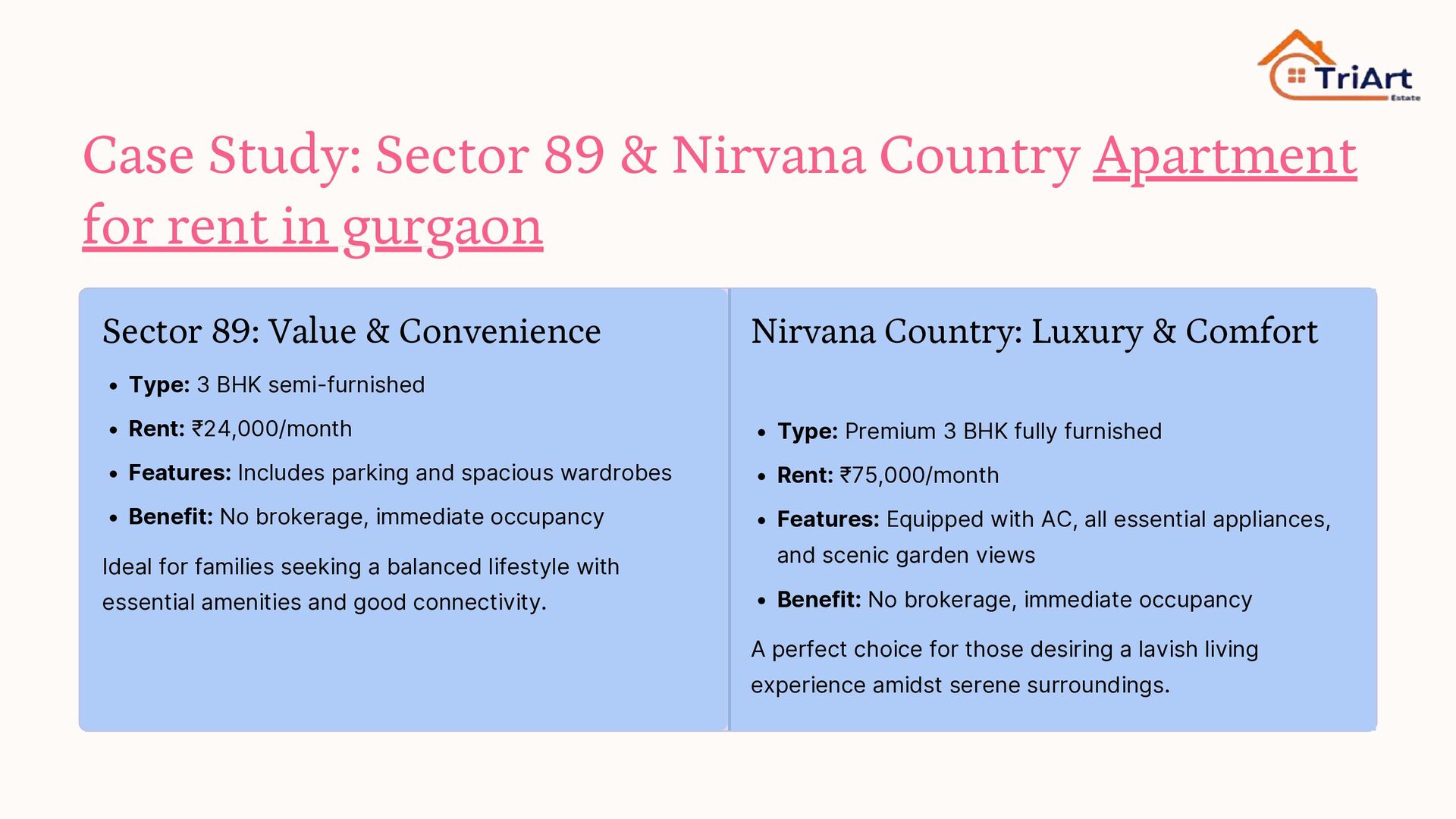 in gurgaon Sector 89: Value & Convenience Type: 3 BHK semi-furnished Rent: ₹24,000/month Features: Includes parking and spacious wardrobes Benefit: No brokerage, immediate occupancy Ideal for families seeking a balanced lifestyle with essential amenities and good connectivity. Nirvana Country: Luxury & Comfort Type: Premium 3 BHK fully furnished Rent: ₹75,000/month Features: Equipped with AC, all essential appliances, and scenic garden views Benefit: No brokerage, immediate occupancy A perfect choice for those desiring a lavish living experience amidst serene surroundings.