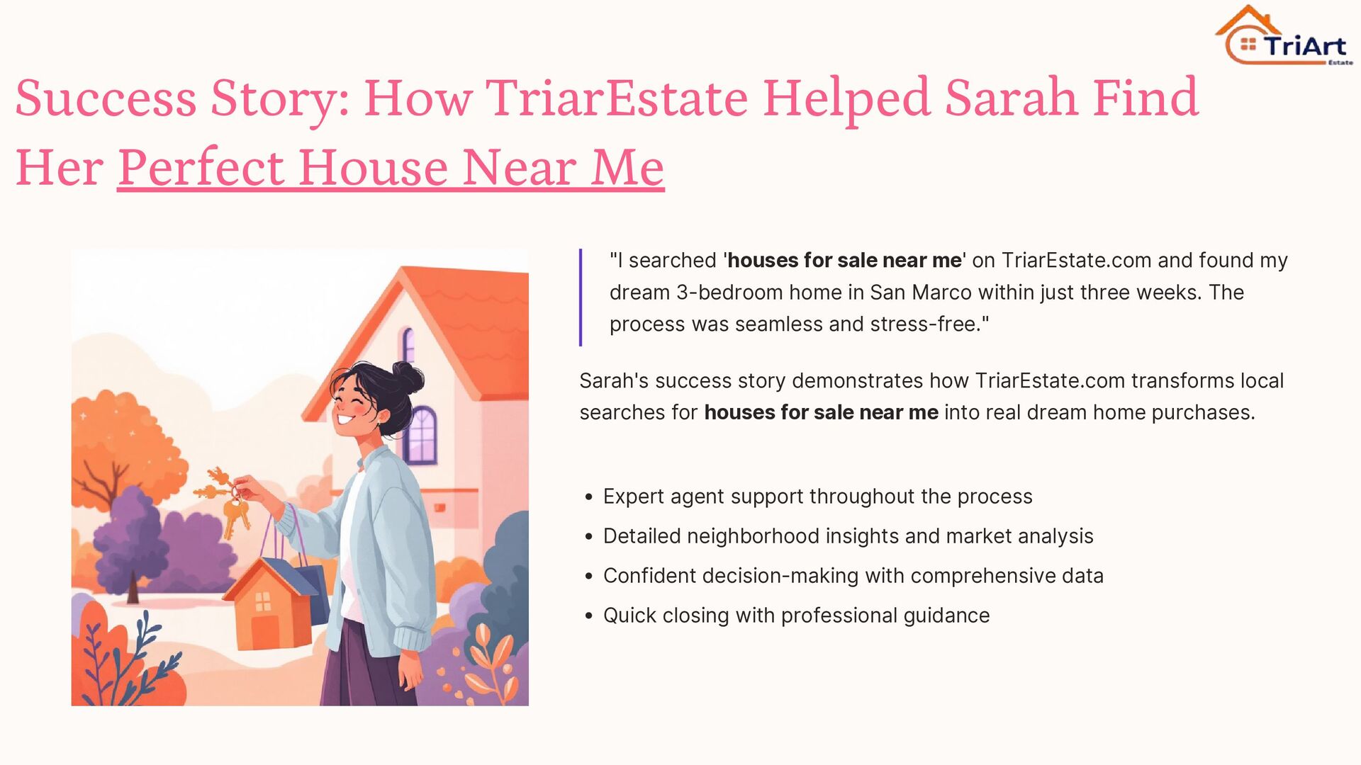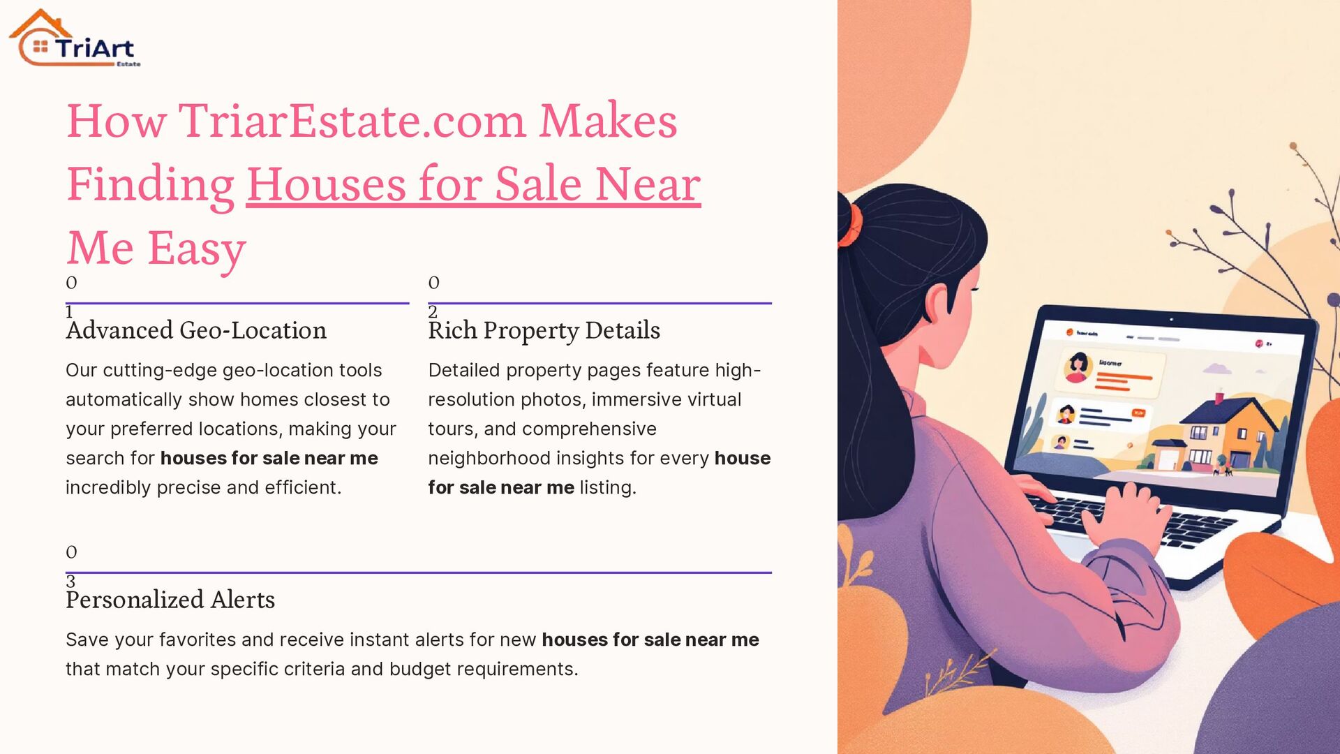 Looking for houses for sale near me? TriArtEstate is your go-to platform to explore verified homes in your area with zero brokerage. Post, search, and connect with sellers & buyers directly — free listings, virtual tours, and expert support at every step.