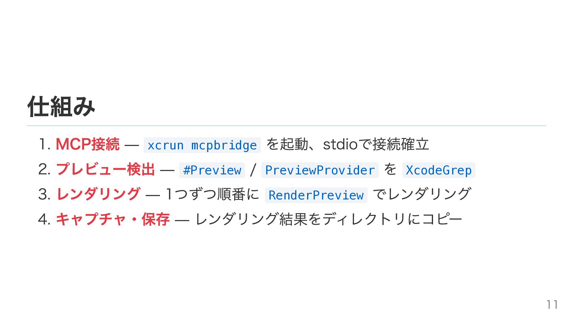 仕組み 1. MCP接続 — xcrun mcpbridge を起動、stdioで接続確立 2. プレビュー検出 —