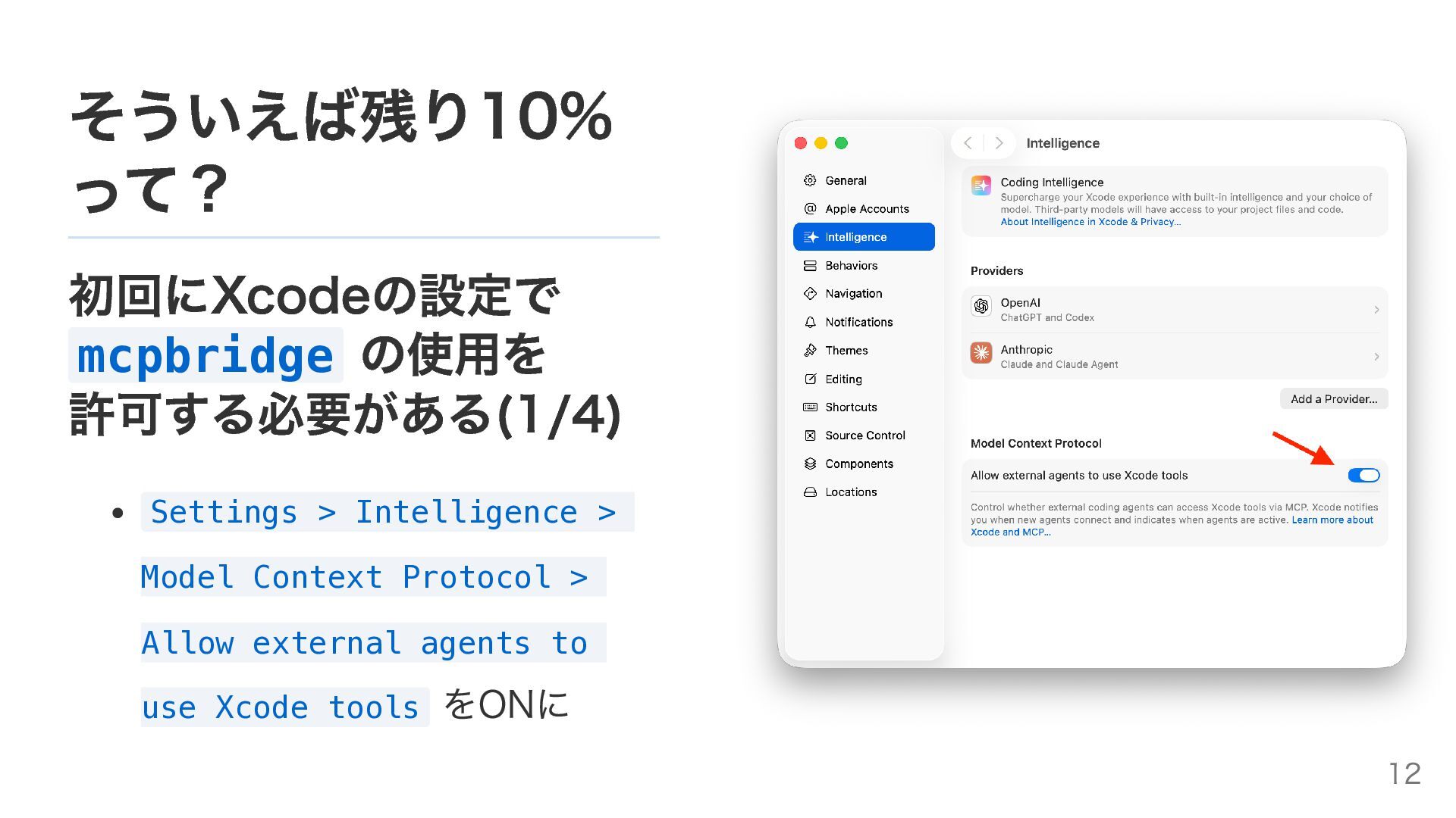 そういえば残り10% って? 初回にXcodeの設定で mcpbridge の使用を 許可する必要がある(1/4) Settings > Intelligence >