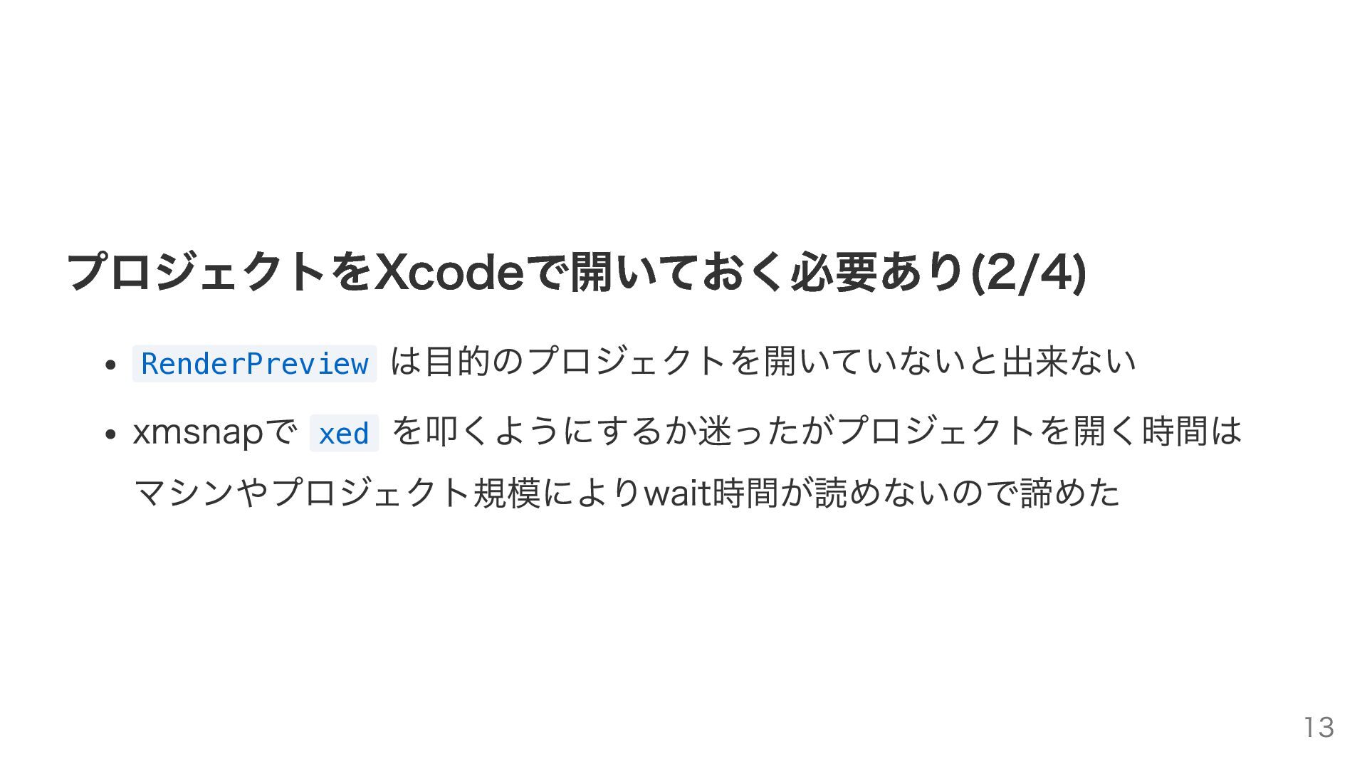 プロジェクトをXcodeで開いておく必要あり(2/4) RenderPreview は目的のプロジェクトを開いていないと出来ない xmsnapで xed を叩くようにするか迷ったがプロジェクトを開く時間は マシンやプロジェクト規模によりwait時間が読めないので諦めた 13