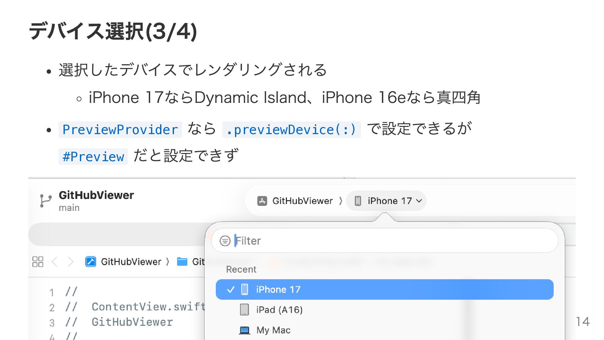 デバイス選択(3/4) 選択したデバイスでレンダリングされる iPhone 17ならDynamic Island、iPhone 16eなら真四角 PreviewProvider なら .previewDevice(:) で設定できるが