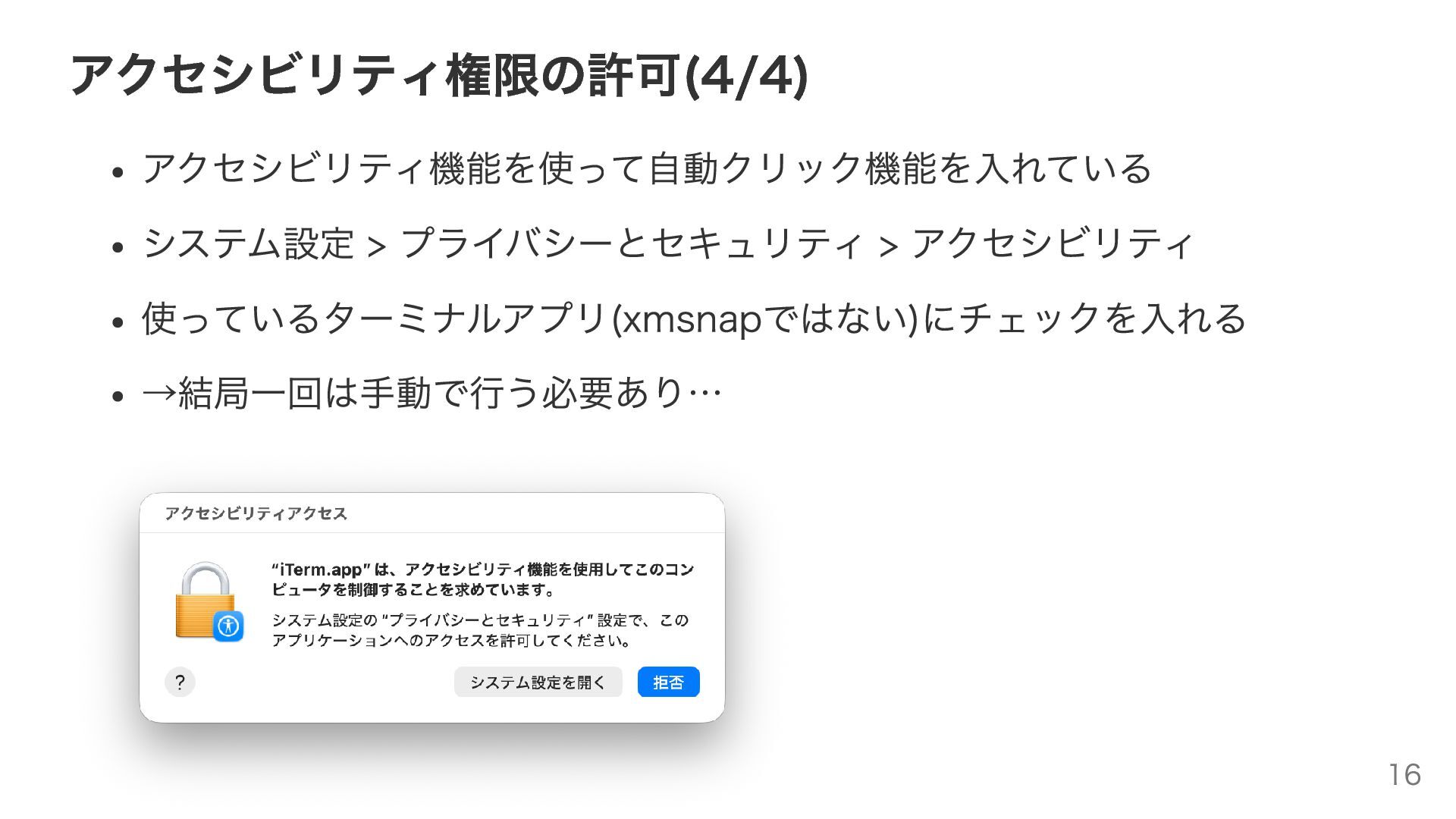 アクセシビリティ権限の許可(4/4) アクセシビリティ機能を使って自動クリック機能を入れている システム設定 > プライバシーとセキュリティ > アクセシビリティ 使っているターミナルアプリ(xmsnapではない)にチェックを入れる →結局一回は手動で行う必要あり… 16