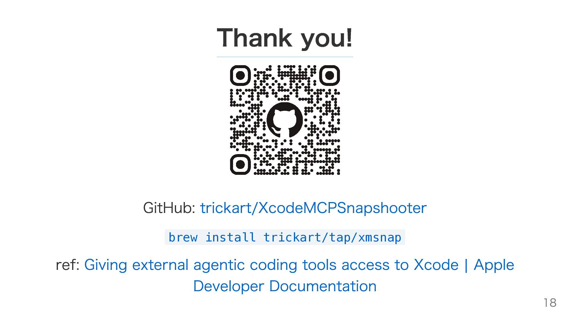 まとめ スクショ撮影の90%は自動化できる時代 Xcode MCP でXcodeをプログラマブルに操作 xmsnapはコマンド(と事前設定)でXcode Previewをキャプチャ 逆に完全には自動化出来ず… CIで使えたらもっと用途が広がるのに… 社内ドキュメント自動更新とかVRTとか