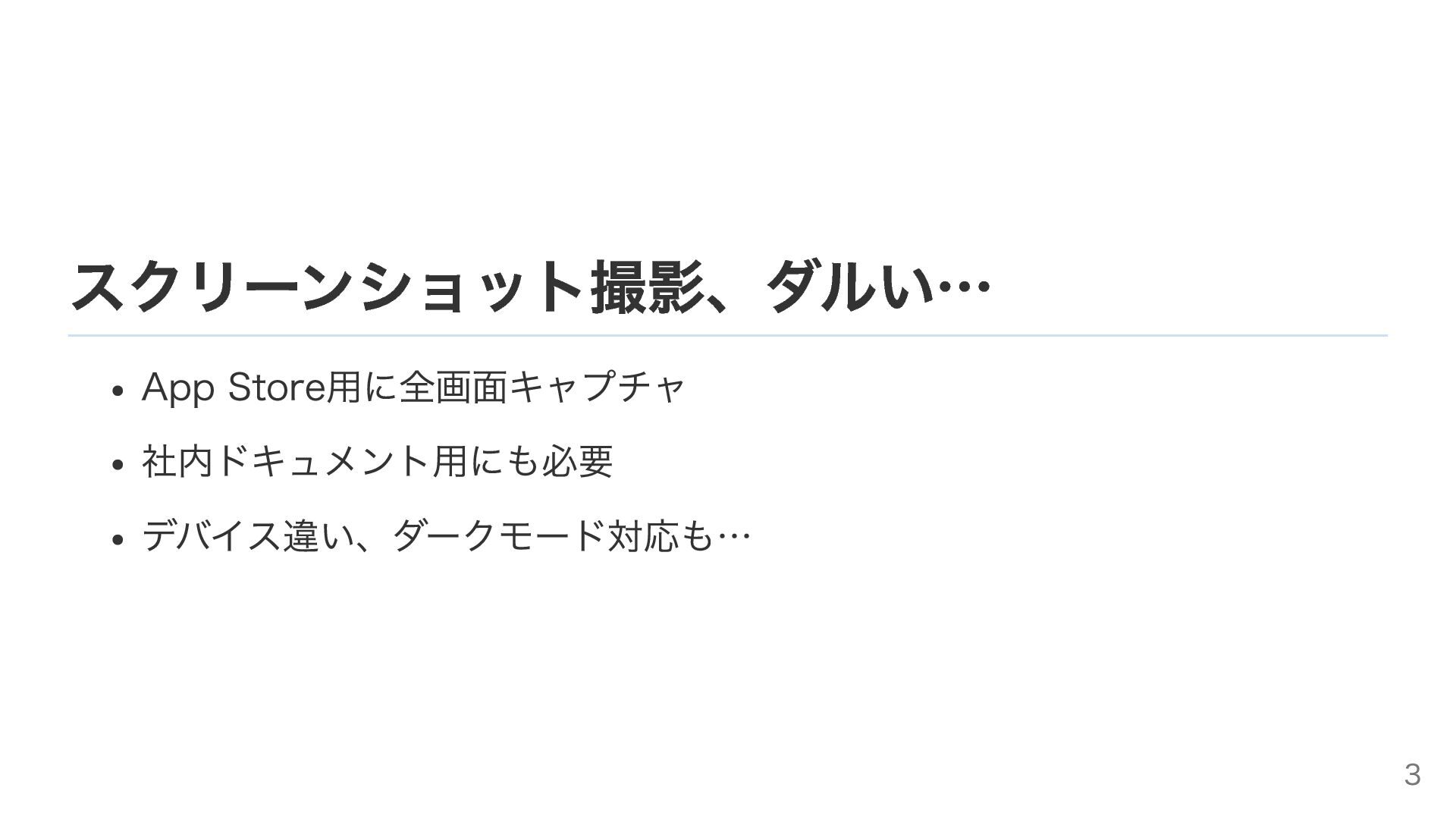 スクリーンショット撮影、ダルい… App Store用に全画面キャプチャ 社内ドキュメント用にも必要 デバイス違い、ダークモード対応も… 3