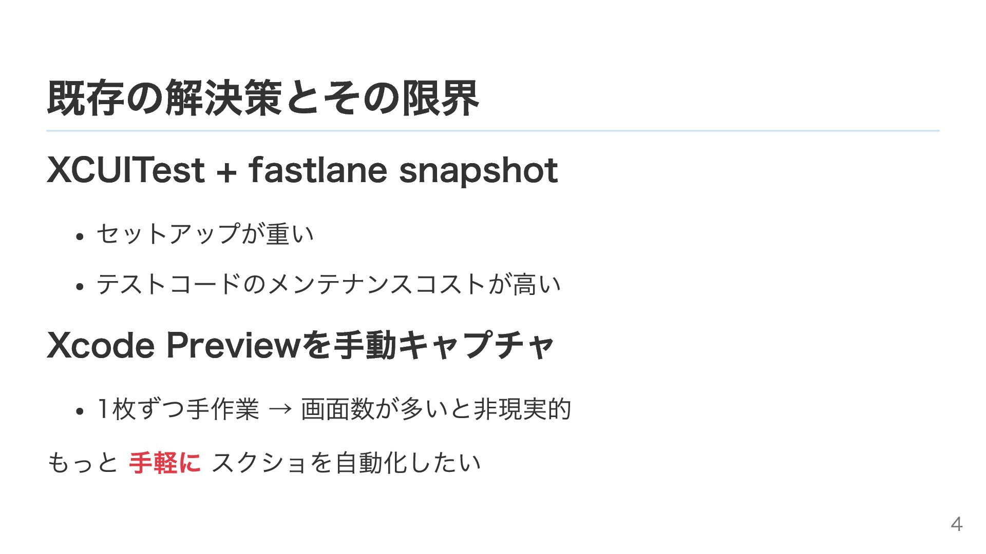 既存の解決策とその限界 XCUITest + fastlane snapshot セットアップが重い テストコードのメンテナンスコストが高い Xcode Previewを手動キャプチャ 1枚ずつ手作業
