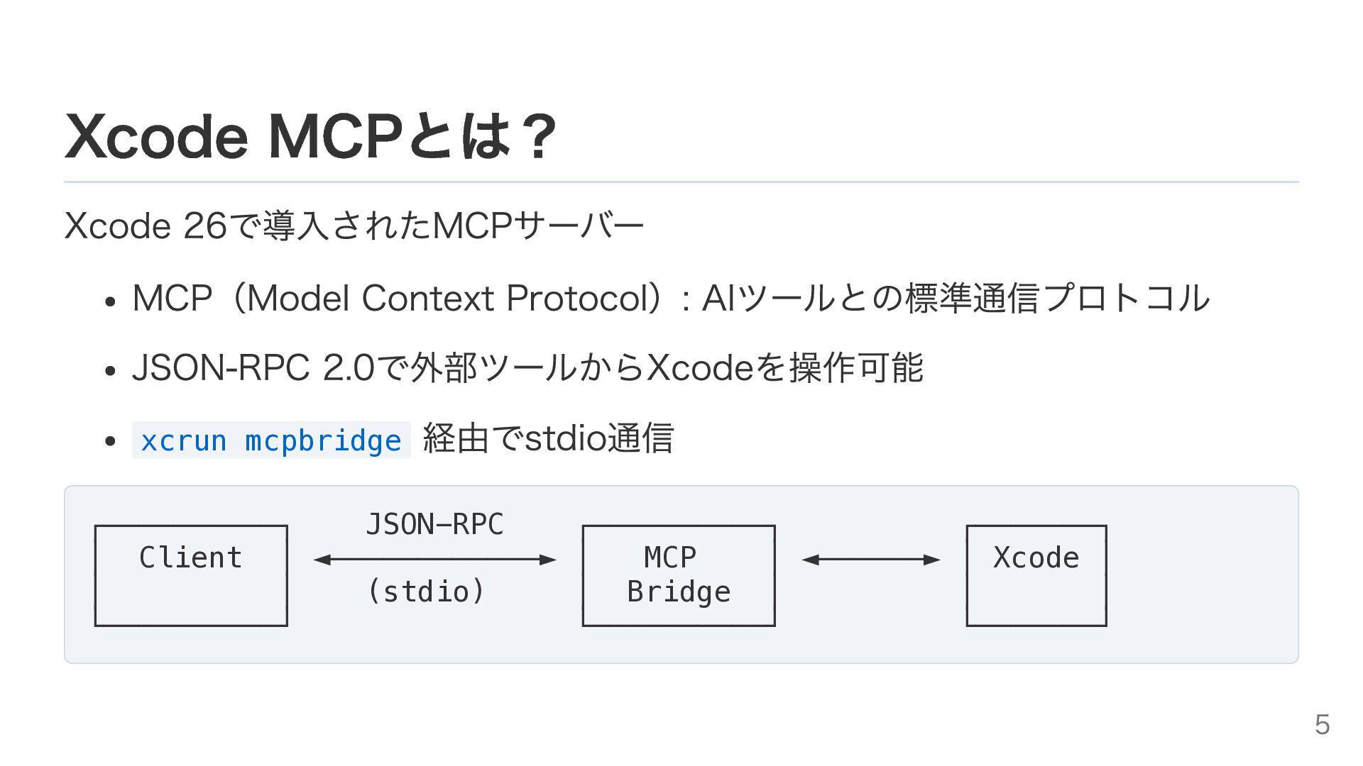 Xcode MCPとは? Xcode 26で導入されたMCPサーバー MCP(Model Context Protocol): AIツールとの標準通信プロトコル JSON-RPC 2.0で外部ツールからXcodeを操作可能