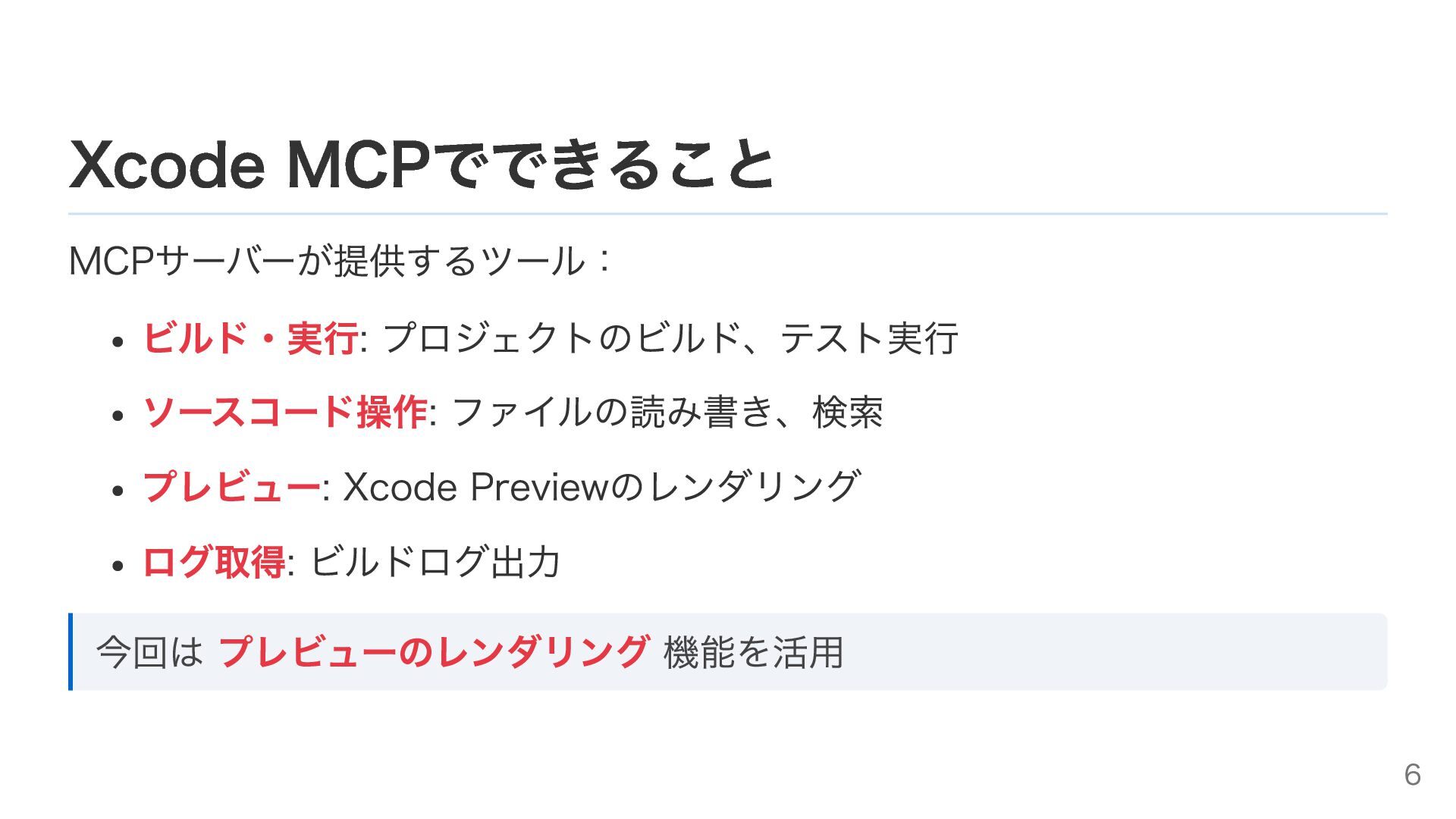 Xcode MCPでできること MCPサーバーが提供するツール: ビルド・実行: プロジェクトのビルド、テスト実行 ソースコード操作: ファイルの読み書き、検索 プレビュー: Xcode Previewのレンダリング