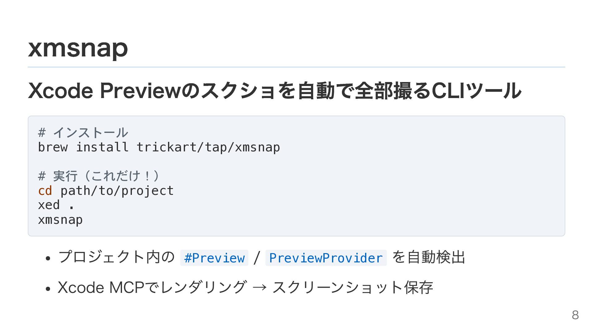 cd path/to/project xed . xmsnap プロジェクト内の #Preview / PreviewProvider を自動検出 Xcode MCPでレンダリング → スクリーンショット保存 8