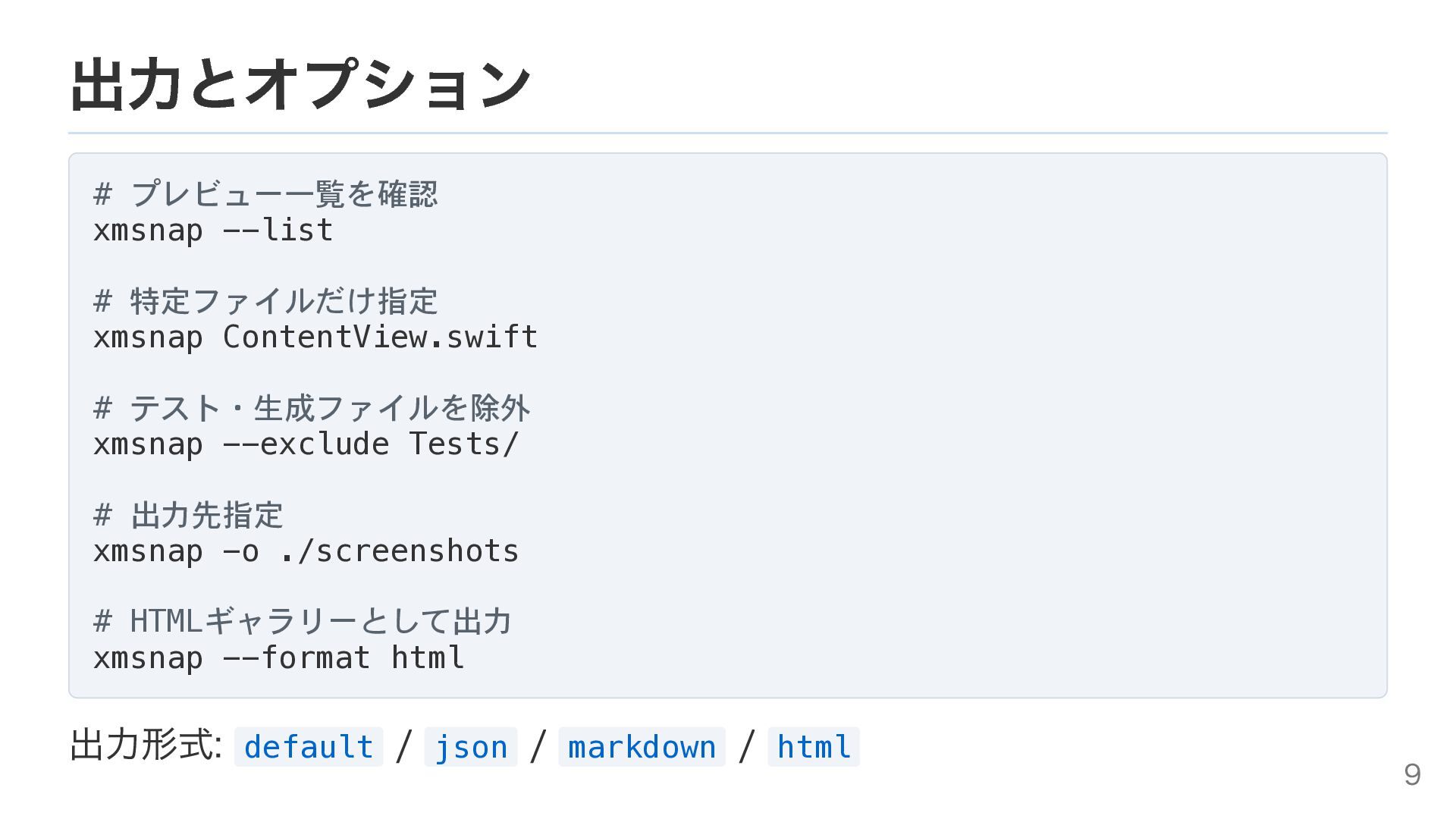 テスト・生成ファイルを除外 xmsnap --exclude Tests/ # 出力先指定 xmsnap -o ./screenshots # HTMLギャラリーとして出力 xmsnap --format html 出力形式: default / json / markdown / html 9