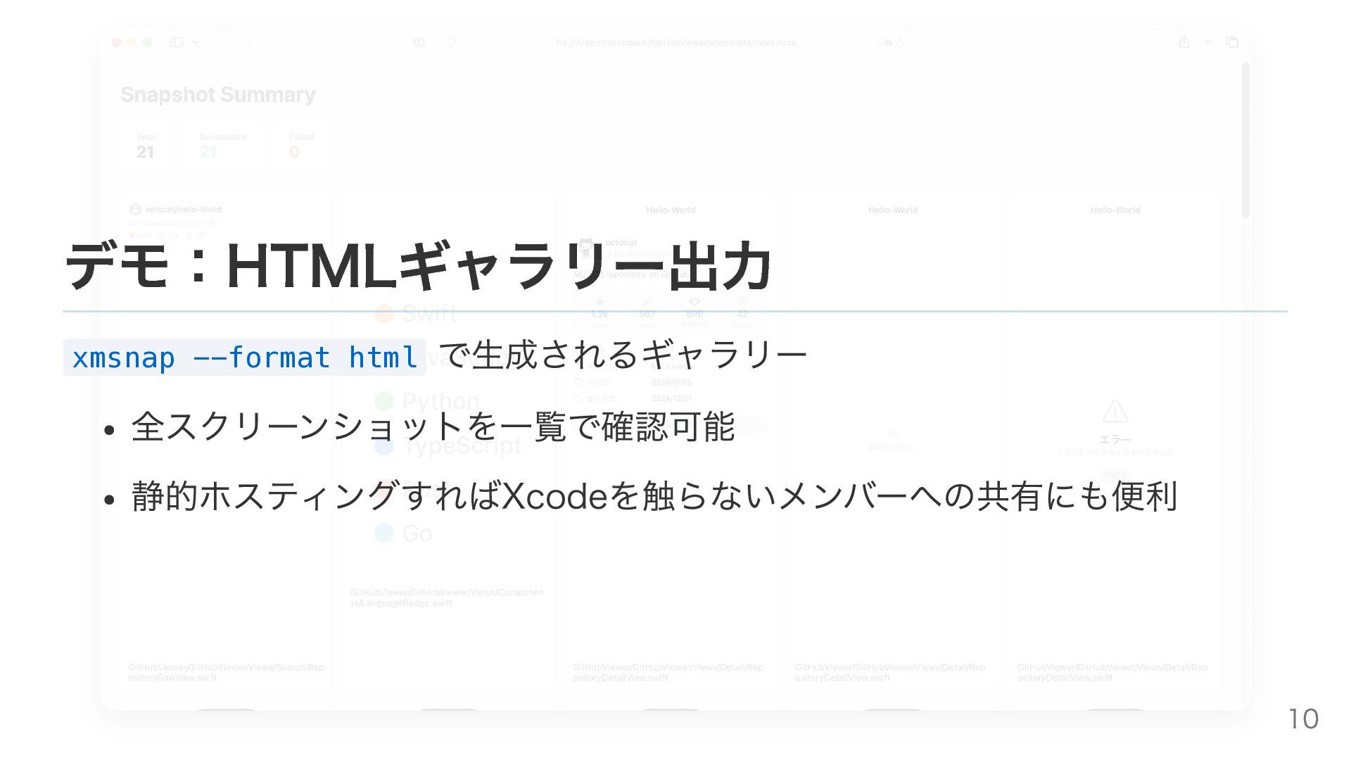 デモ:HTMLギャラリー出力 xmsnap --format html で生成されるギャラリー 全スクリーンショットを一覧で確認可能 静的ホスティングすればXcodeを触らないメンバーへの共有にも便利 10