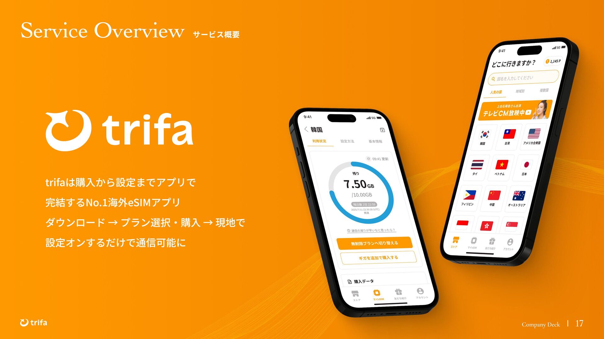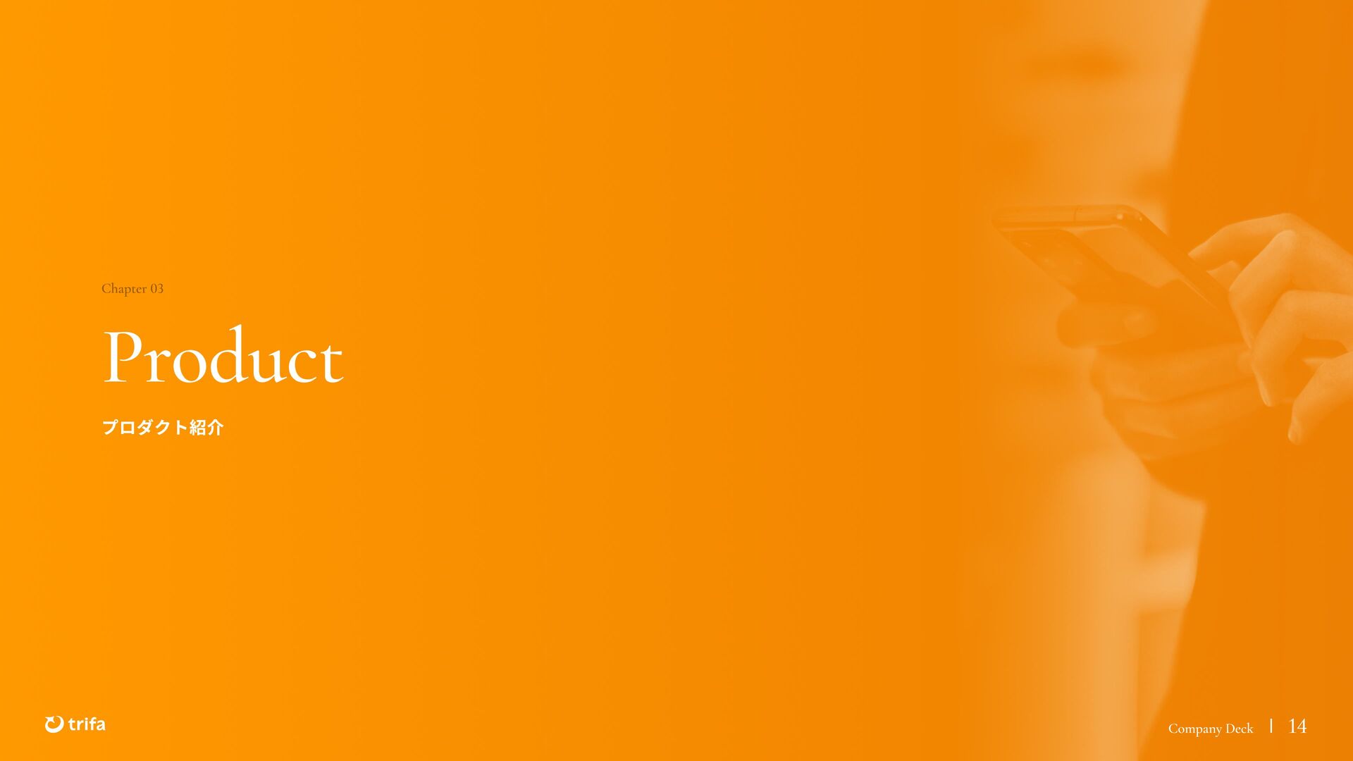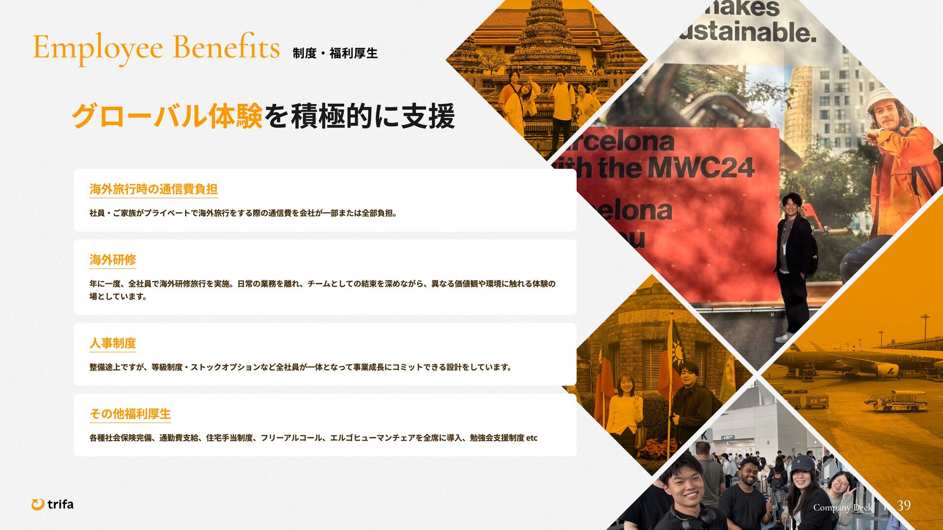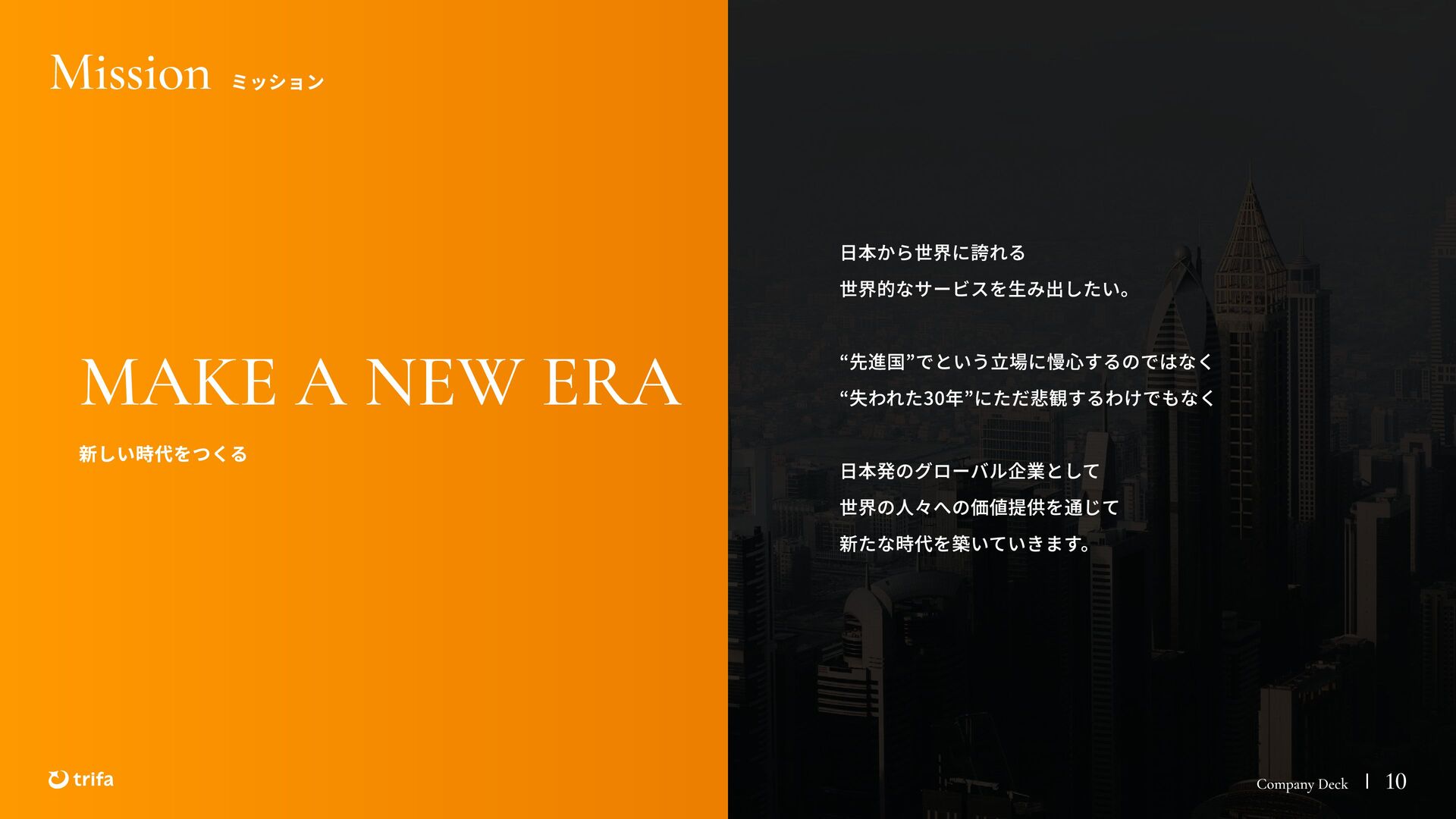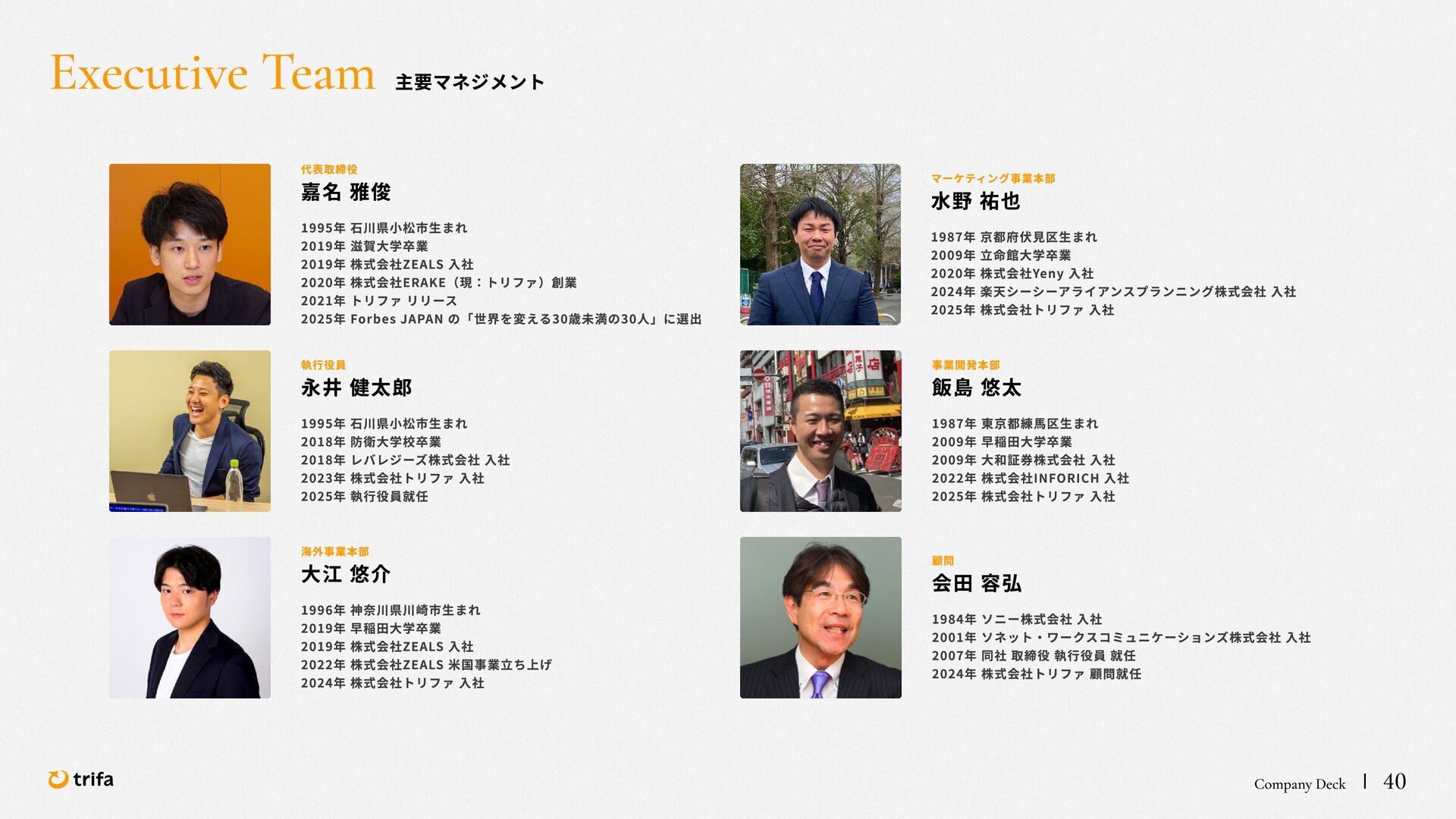 2019年 株式会社ZEALS 入社 2020年 株式会社ERAKE(現:トリファ)創業 2021年 トリファ リリース 2025年 Forbes JAPAN の「世界を変える30歳未満の30人」に選出 執行役員 永井 健太郎 1995年 石川県小松市生まれ 2018年 防衛大学校卒業 2018年 レバレジーズ株式会社 入社 2023年 株式会社トリファ 入社 2025年 執行役員就任 海外事業本部 大江 悠介 1996年 神奈川県川崎市生まれ 2019年 早稲田大学卒業 2019年 株式会社ZEALS 入社 2022年 株式会社ZEALS 米国事業立ち上げ 2024年 株式会社トリファ 入社 マーケティング事業本部 水野 祐也 198 7年 京都府伏見区生まれ 2009年 立 命館大学卒業 2020年 株式会社 Ye ny 入社 2024年 楽天シー シー アライアン スプラン ニング株式会社 入社 2025年 株式会社トリファ 入社 事業 開発本部 飯島 悠太 198 7年 東京都練馬区生まれ 2009年 早稲田大学卒業 2009年 大 和証券株式会社 入社 2022年 株式会社 INF OR ICH 入社 2025年 株式会社トリファ 入社 顧問 会田 容弘 1984年 ソニー株式会社 入社 2001年 ソネ ット ・ワー クスコミュニケー ションズ株式会社 入社 200 7年 同社 取締役 執行役員 就 任 2024年 株式会社トリファ 顧問就任 Com pa ny Dec k 40