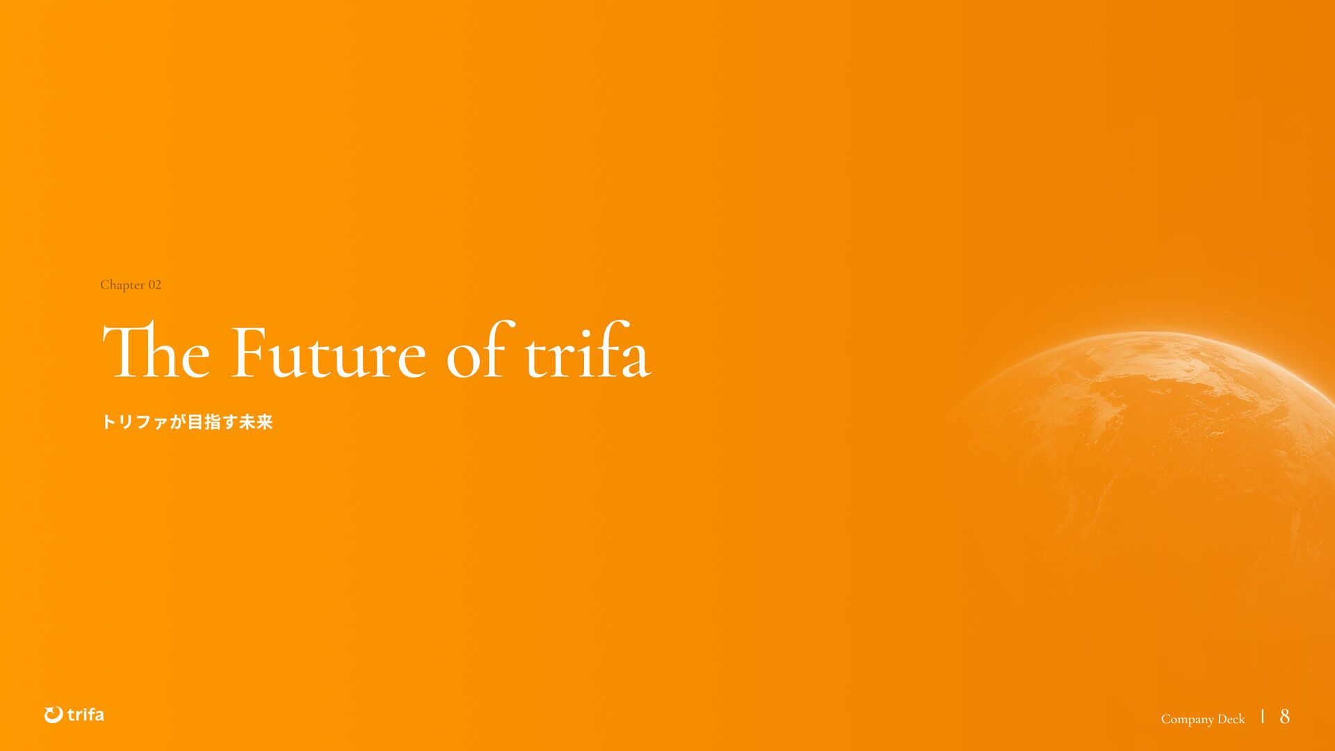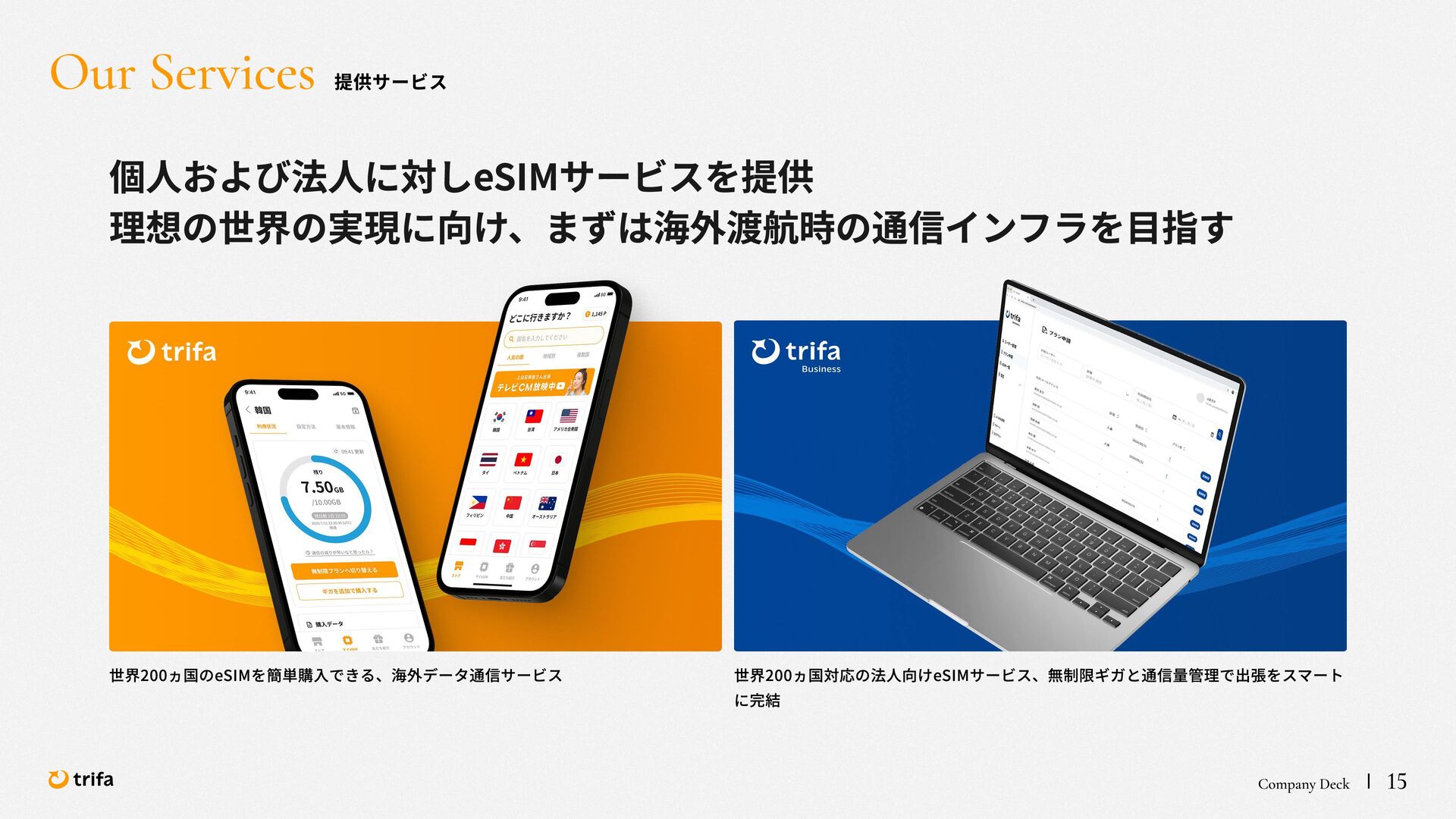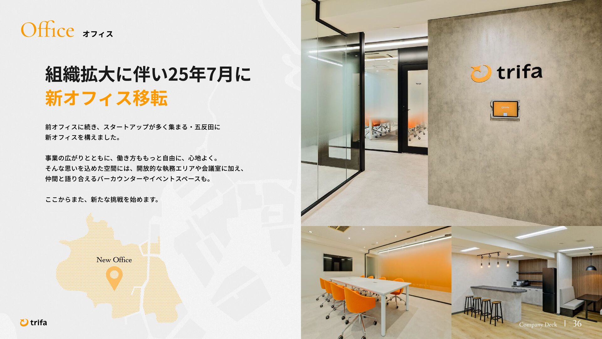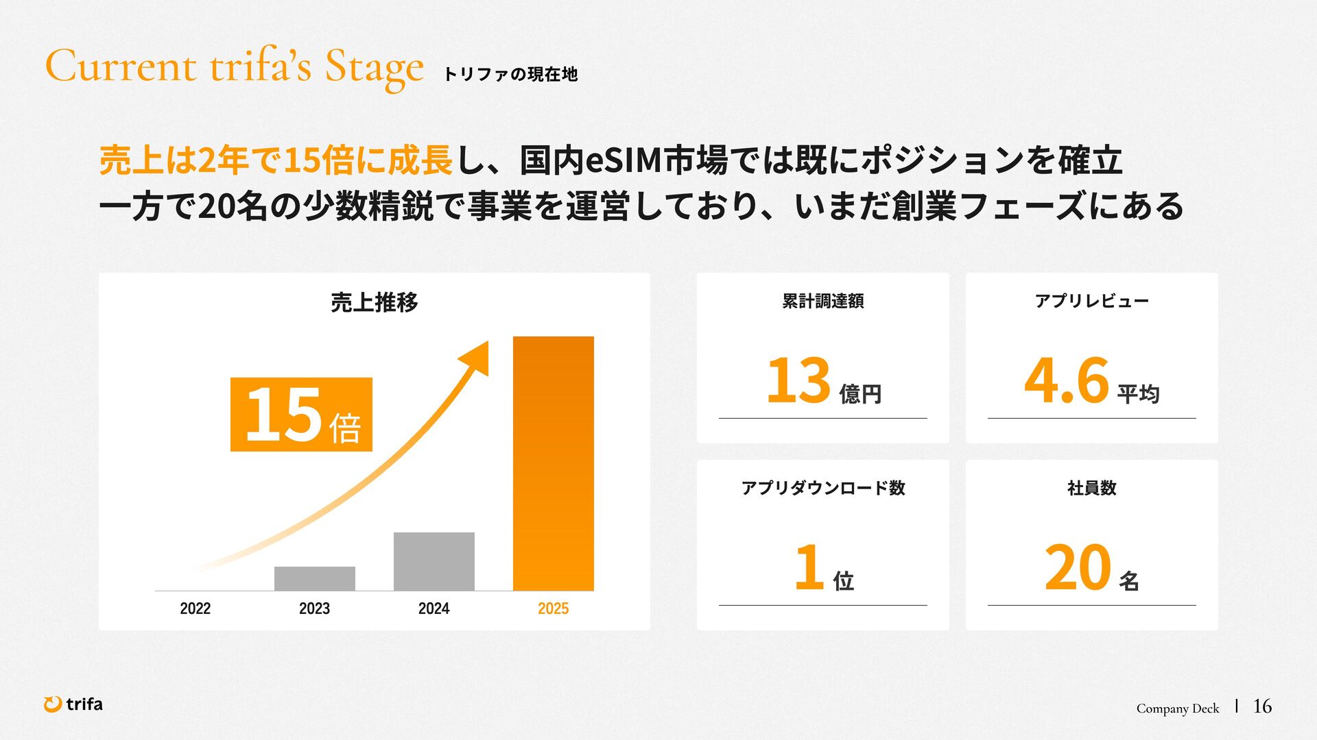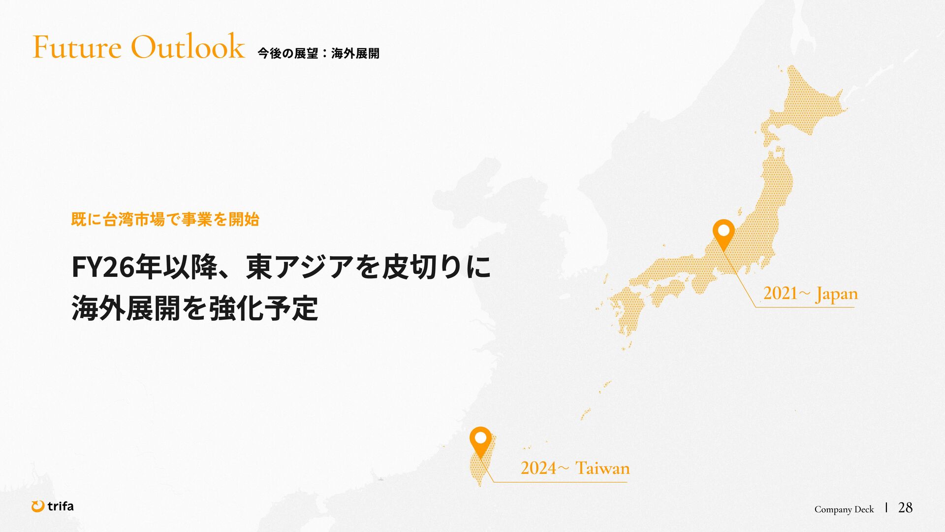 2019年 株式会社ZEALS 入社 2020年 株式会社ERAKE(現:トリファ)創業 2021年 トリファ リリース 2025年 Forbes JAPAN の「世界を変える30歳未満の30人」に選出 執行役員 永井 健太郎 1995年 石川県小松市生まれ 2018年 防衛大学校卒業 2018年 レバレジーズ株式会社 入社 2023年 株式会社トリファ 入社 2025年 執行役員就任 海外事業本部 大江 悠介 1996年 神奈川県川崎市生まれ 2019年 早稲田大学卒業 2019年 株式会社ZEALS 入社 2022年 株式会社ZEALS 米国事業立ち上げ 2024年 株式会社トリファ 入社 マーケティング事業本部 水野 祐也 198 7年 京都府伏見区生まれ 2009年 立 命館大学卒業 2020年 株式会社 Ye ny 入社 2024年 楽天シー シー アライアン スプラン ニング株式会社 入社 2025年 株式会社トリファ 入社 事業 開発本部 飯島 悠太 198 7年 東京都練馬区生まれ 2009年 早稲田大学卒業 2009年 大 和証券株式会社 入社 2022年 株式会社 INF OR ICH 入社 2025年 株式会社トリファ 入社 顧問 会田 容弘 1984年 ソニー株式会社 入社 2001年 ソネ ット ・ワー クスコミュニケー ションズ株式会社 入社 200 7年 同社 取締役 執行役員 就 任 2024年 株式会社トリファ 顧問就任 Com pa ny Dec k 40